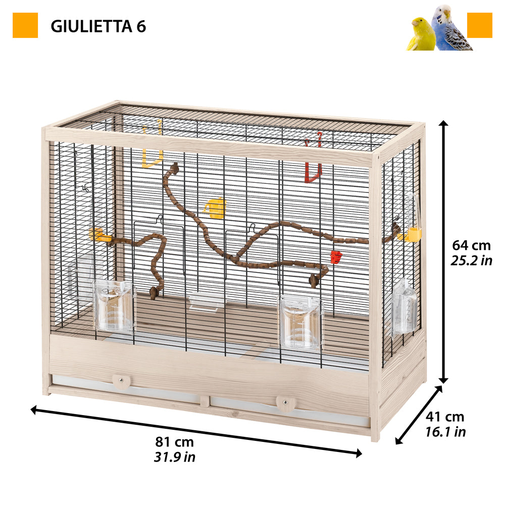 Giulietta 6 is a cage for canaries or small exotic birds with a basic, linear design, characterised by a structure with columns and frame made of robust wood, FSC™ certified, that is sourced from forests that are managed correctly and responsibly according to strict environmental, social and economic standards and other controlled sources. The wood is treated with a special non-toxic, anti-mould paint that is UV-resistant and water repellent, painted using \flow coating\ processes for greater durability over time.