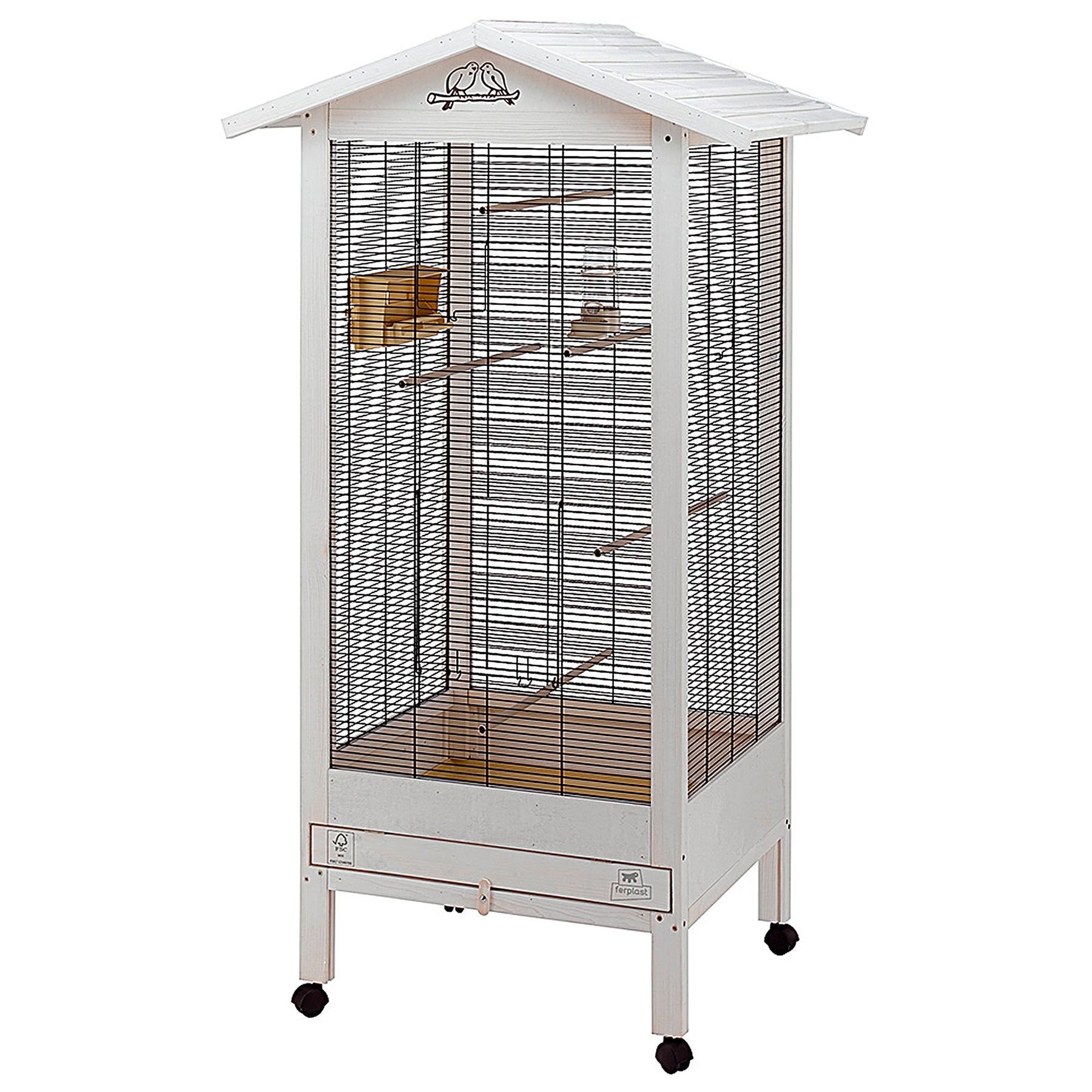 Hemmy is an elegant aviary for canaries, budgeridges and exotic birds, made of wood and has refined decorations of small birds in the front area. The cage is made of FSC™ certified wood, that is sourced from forests that are managed correctly and responsibly according to strict environmental, social and economic standards and other controlled sources; treated with a special non-toxic, anti-mould paint that is U.V.-resistant and water repellent, painted using \flow coating\ processes for greater durability over time. The wire mesh is made from strong varnished metal. Hemmy is a modern, carefully designed wooden aviary, painted in delicate pastel colours and comes complete with everything you need to accommodate several birds together, in comfort.