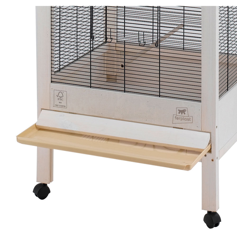 It is easy to clean, thanks to its removable inner tray. It also has wheels, making it easy to move to your favourite spot. Moreover, for tiny maintenance operations the habitat is equipped with front and side small openable doors, all equipped with safety closing hooks. Inside, you can place the essential accessories included, like perches, a plastic drinking bottle and Brava 6 swivel feeders. Swivel feeders, thanks to the particular mechanism they are equipped with, can be rotated 180° and be filled with food from the outside in a easy and fast way, without leaving any openings from which your bird can escape. Safe, the aviary is equiped with doors with a special closing hook, designed ad hoc to prevent accidental leaks.