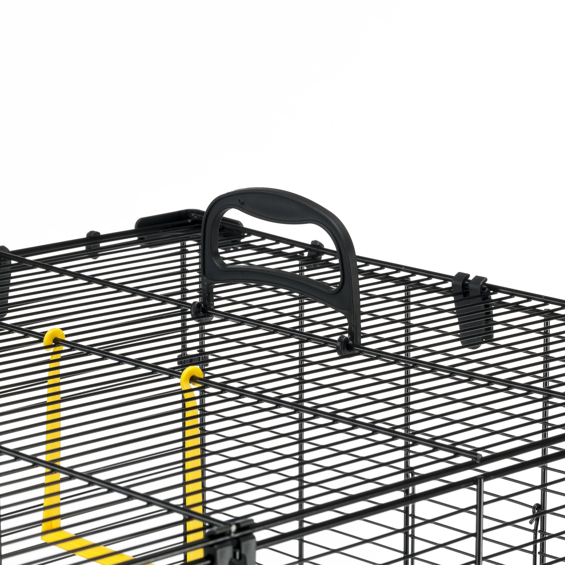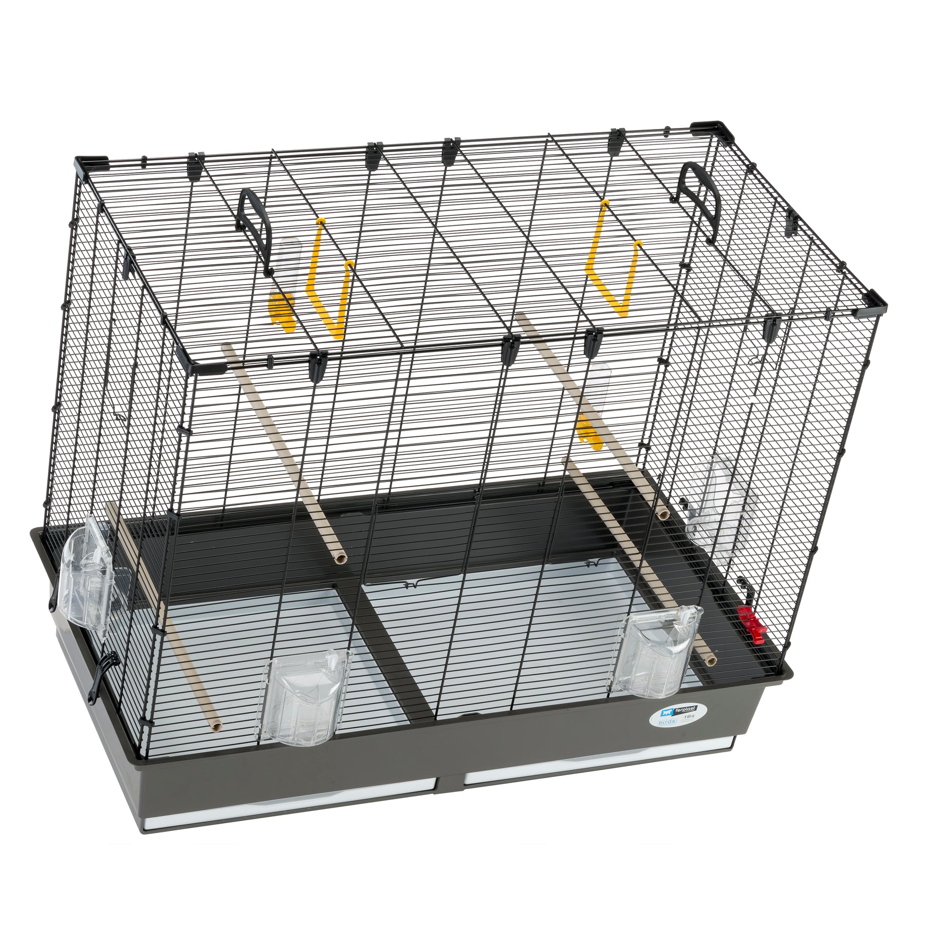 Comfortable handles applied on the roof allow easy movement. It is also equipped with a large plastic bottom with two removable drawers for easy and quick cleaning. Accessories included: plastic perches, drinking bottles, vegetable clip.