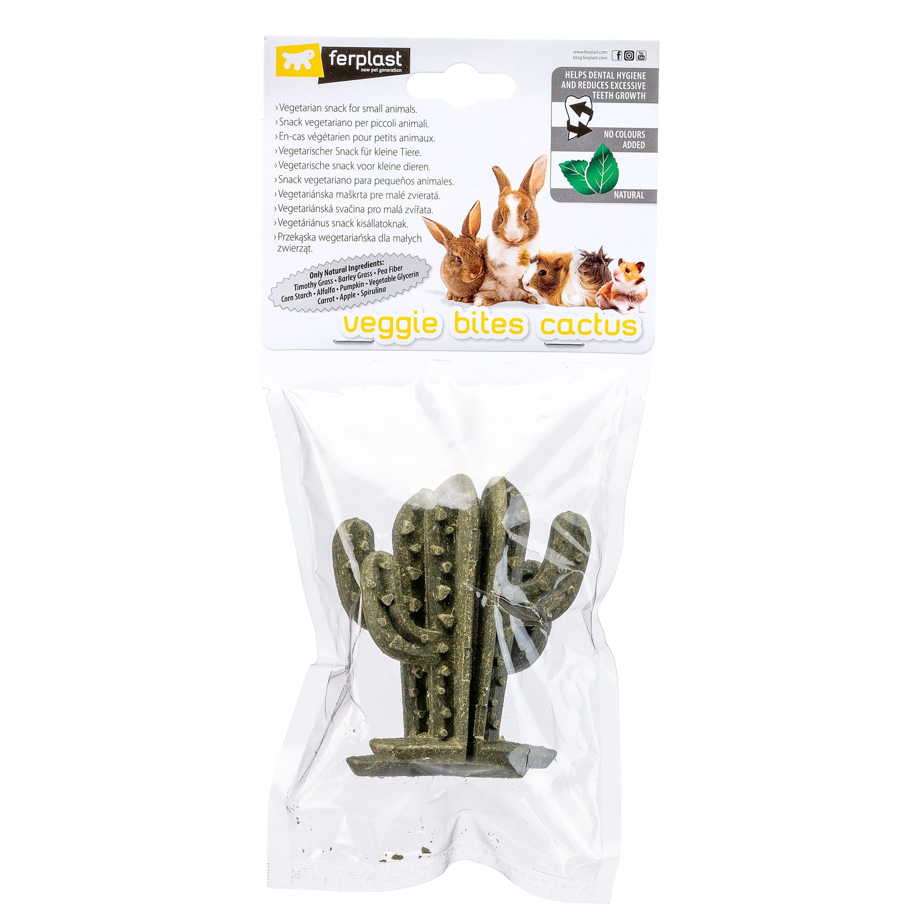 Thanks to its triple function — complementary treat, chewing snack and dental support treat — Veggie Bites Cactus is a practical solution for enriching the daily environment of small pets. Made with timothy grass, barley grass, pea fibre, corn starch, alfalfa, pumpkin, vegetable glycerine, carrot, apple and spirulina, it offers variety and naturalness in every bite.