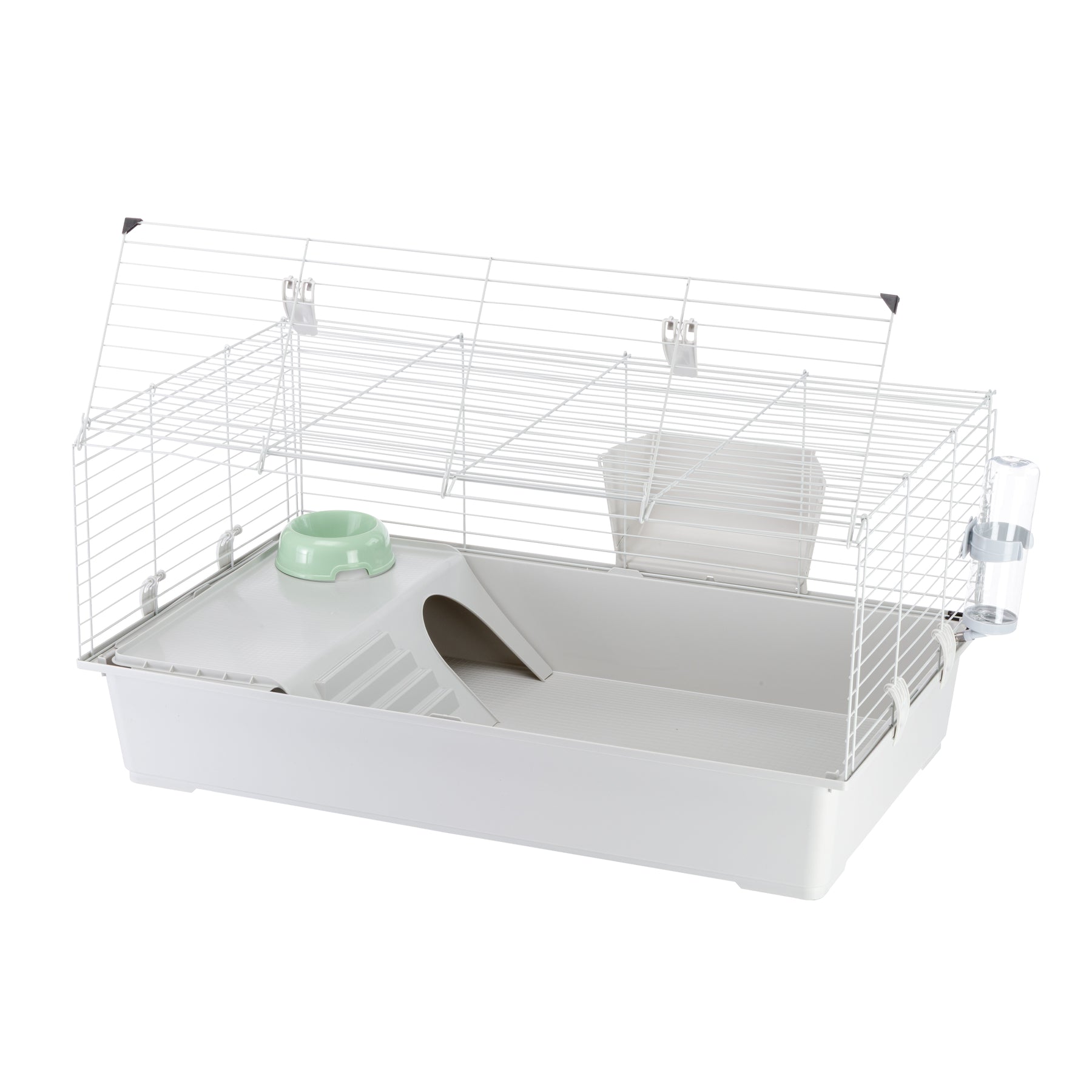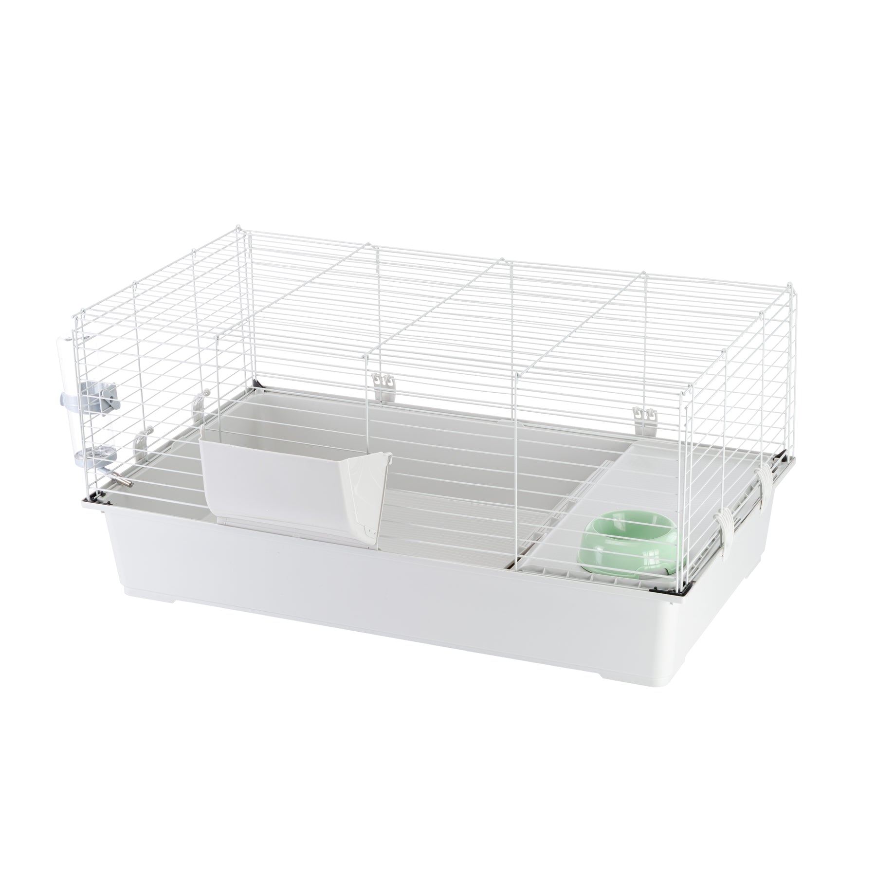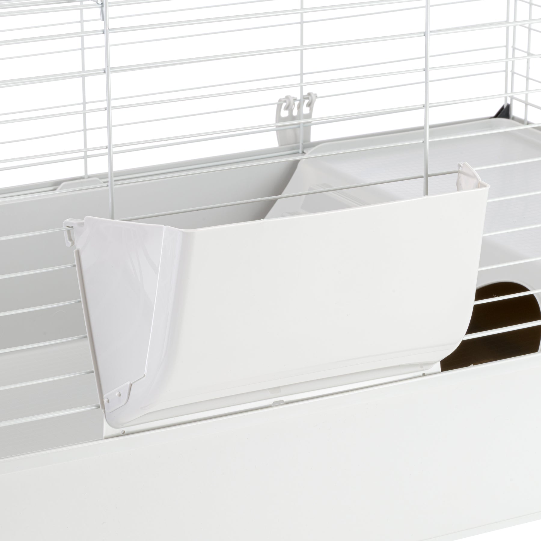 Perfect for rabbits and guinea pigs, Rabbit 100 has a deep coloured plastic bottom on which a metal mesh is placed. The mesh is coated with special corrosion-resistant paint, and can be completely lifted from the front side, for easier access. This also makes everyday cleaning easier. For deeper cleaning operations, simply detach the bottom by unhooking the snapping flaps on the sides, which were designed for extra safety.