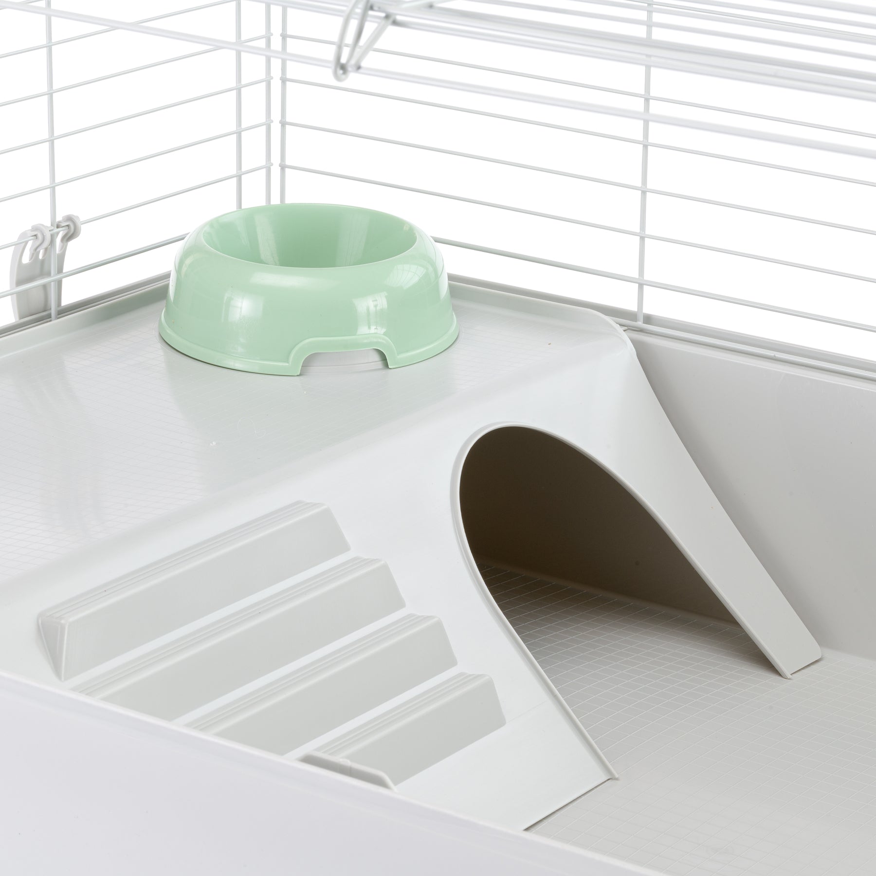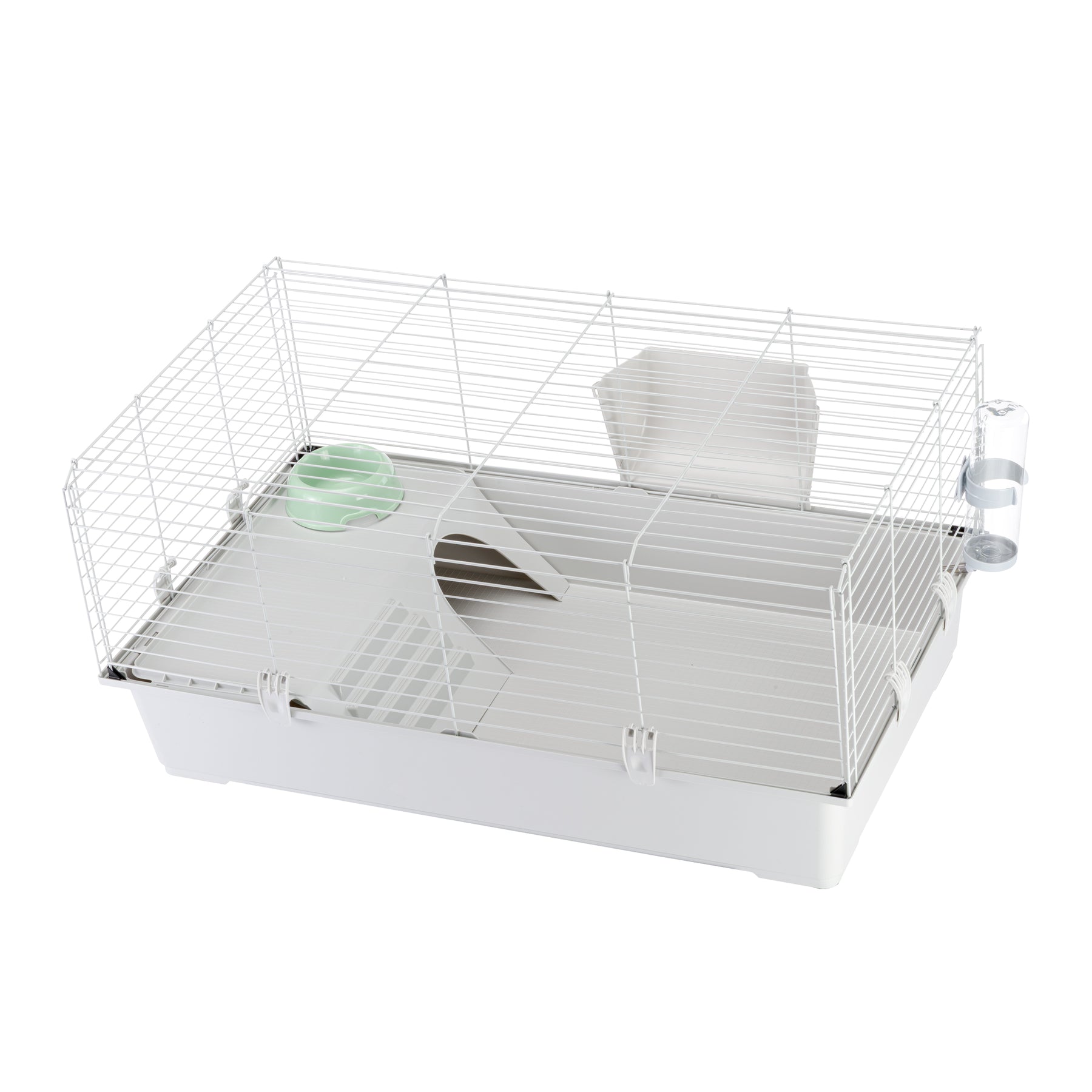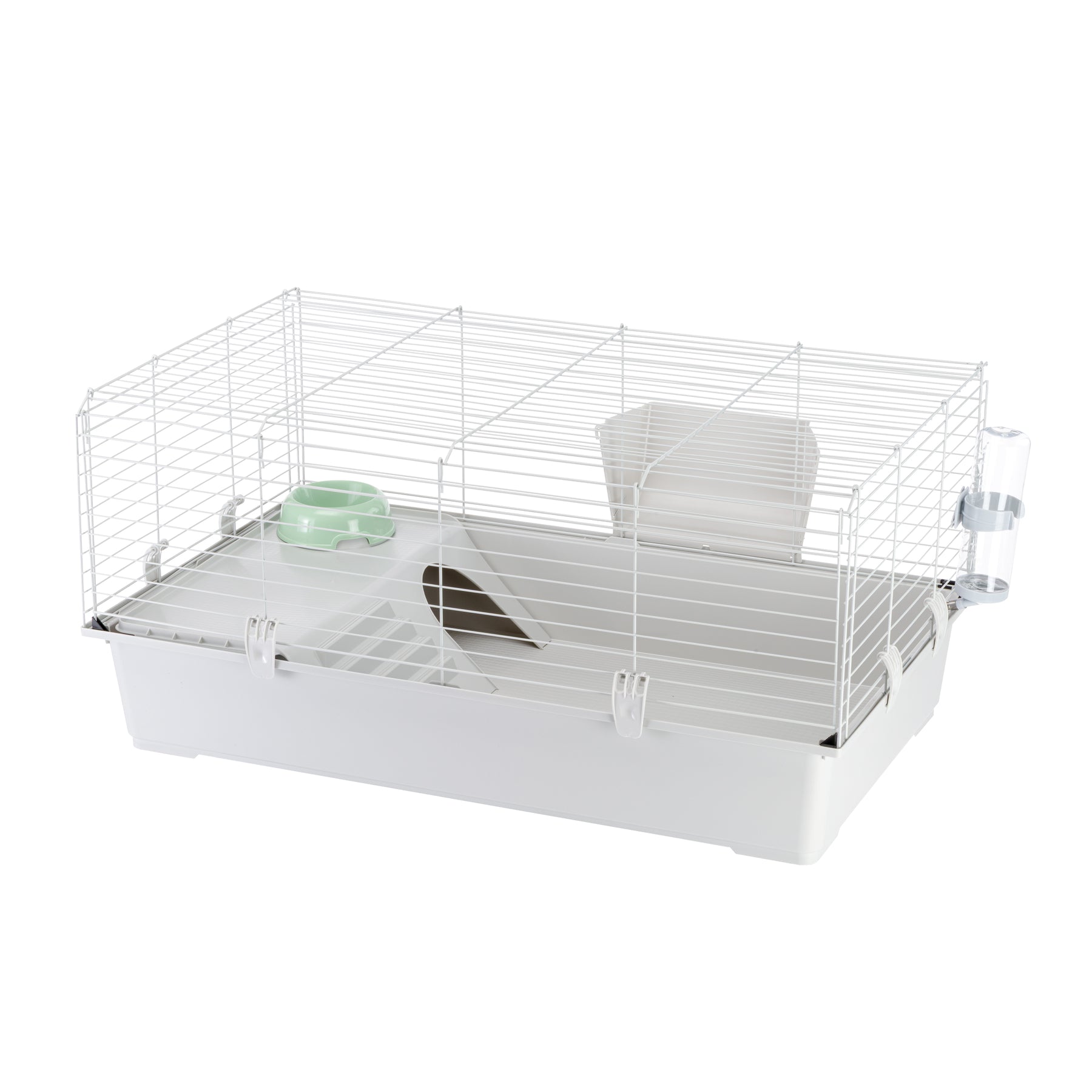 Perfect for rabbits and guinea pigs, Rabbit 100 has a deep coloured plastic bottom on which a metal mesh is placed. The mesh is coated with special corrosion-resistant paint, and can be completely lifted from the front side, for easier access. This also makes everyday cleaning easier. For deeper cleaning operations, simply detach the bottom by unhooking the snapping flaps on the sides, which were designed for extra safety.