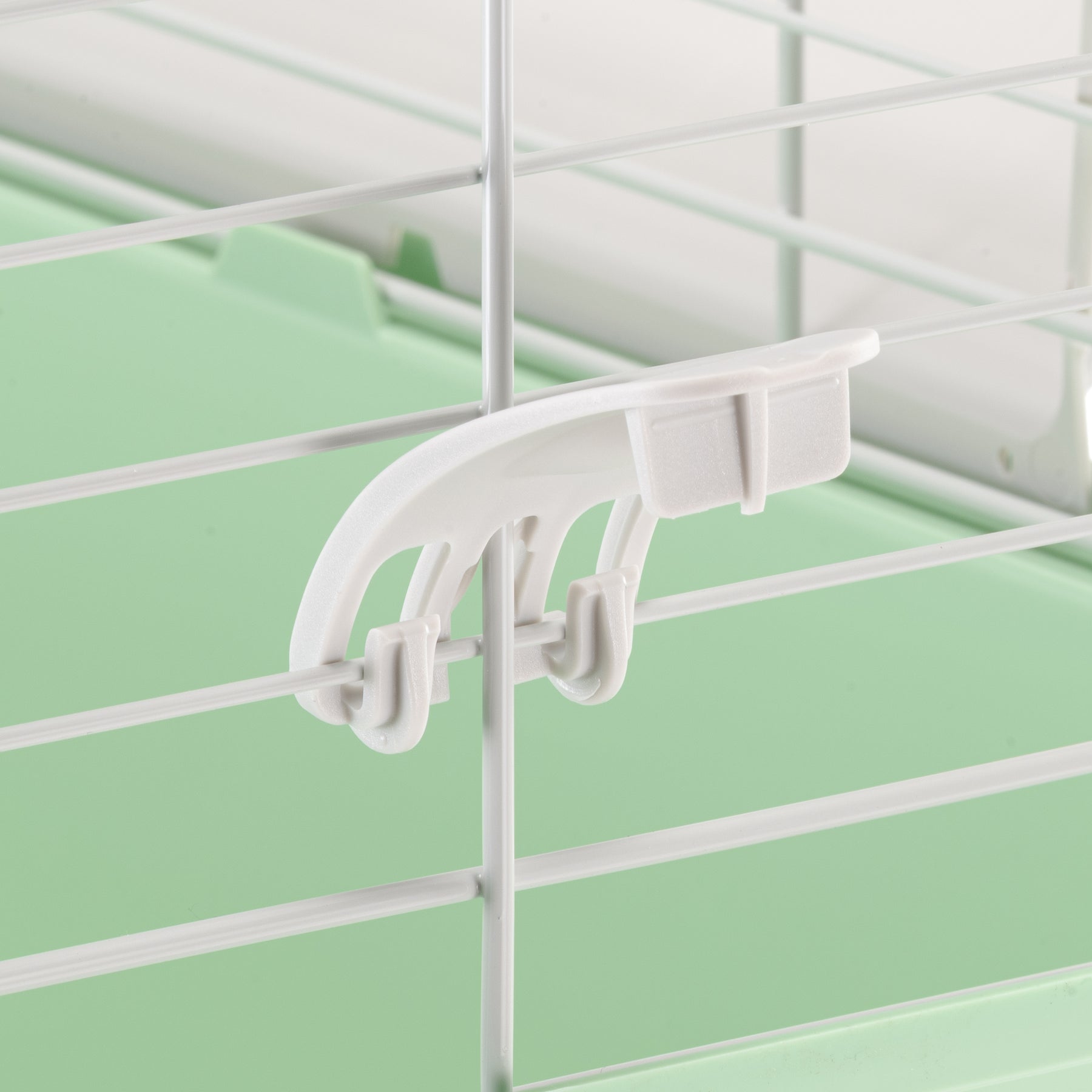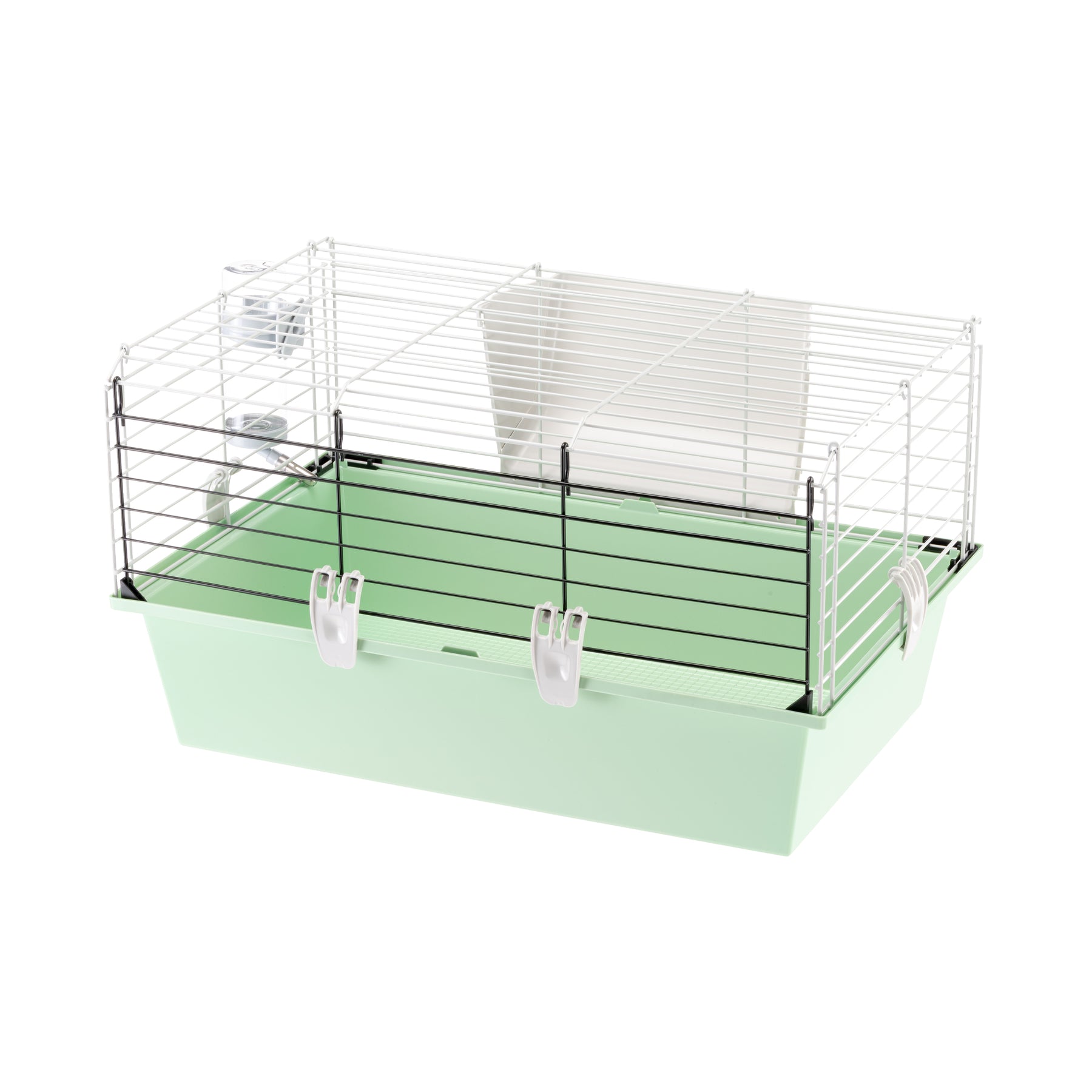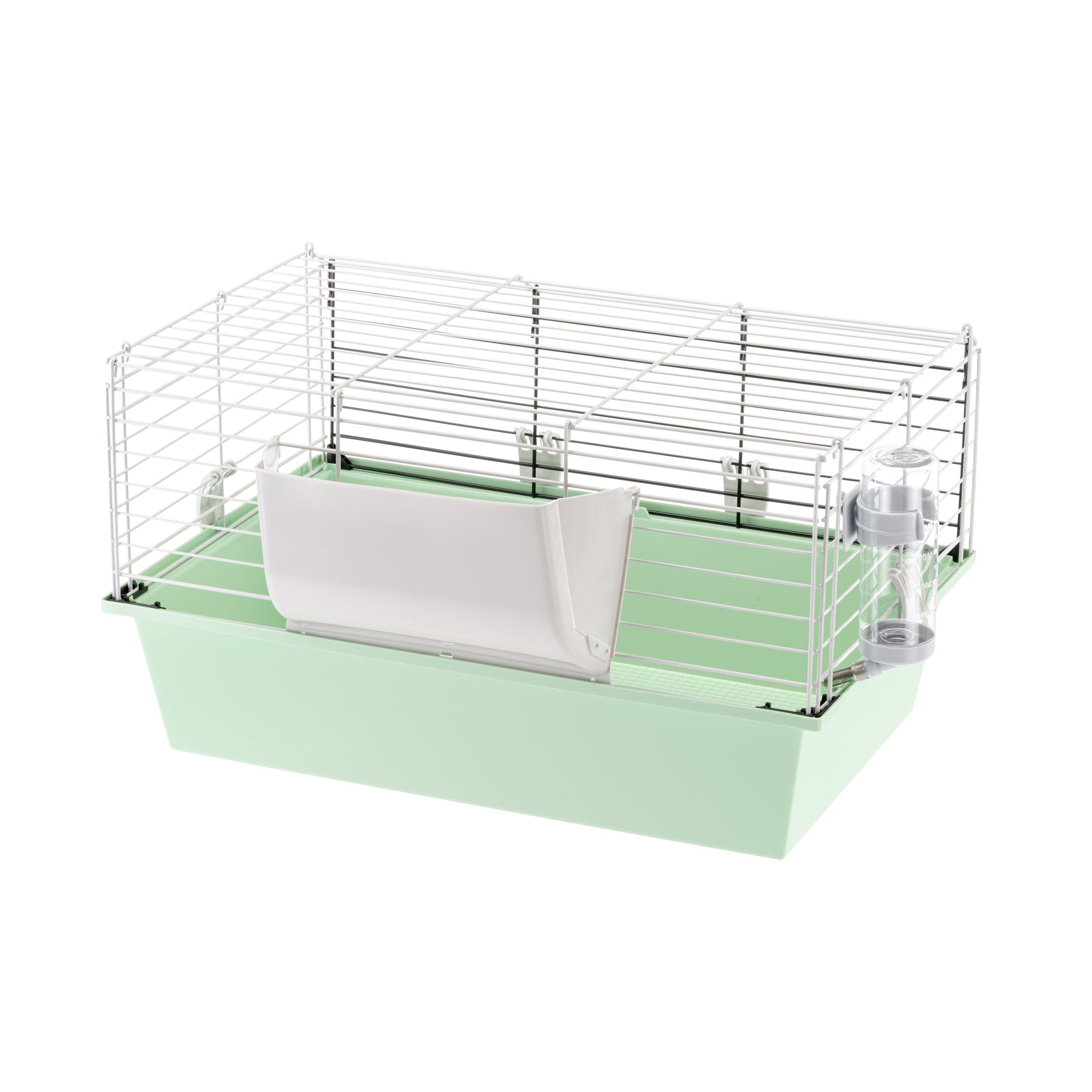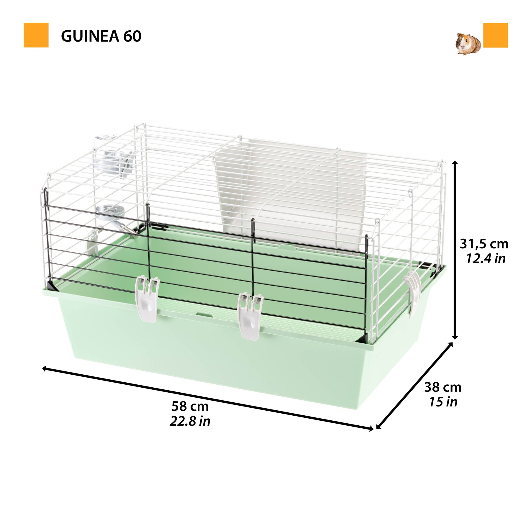 Guinea 60 is a guinea pig cage with a recently renewed opening and closing system, ensuring total safety for your little pets. The habitat has a traditional structure with a plastic base and a varnished wire mesh structure. The door at the front can be opened completely, for easy cleaning. Inside, you will find accessories, including a drinking bottle and a plastic feeder for hay. Guinea 60 is an environmentally friendly product in the Save Space brand range. It is sold in a space-saving package and can be completely dismantled.
