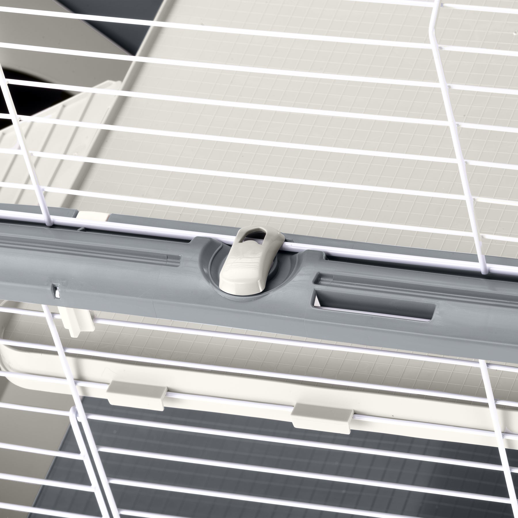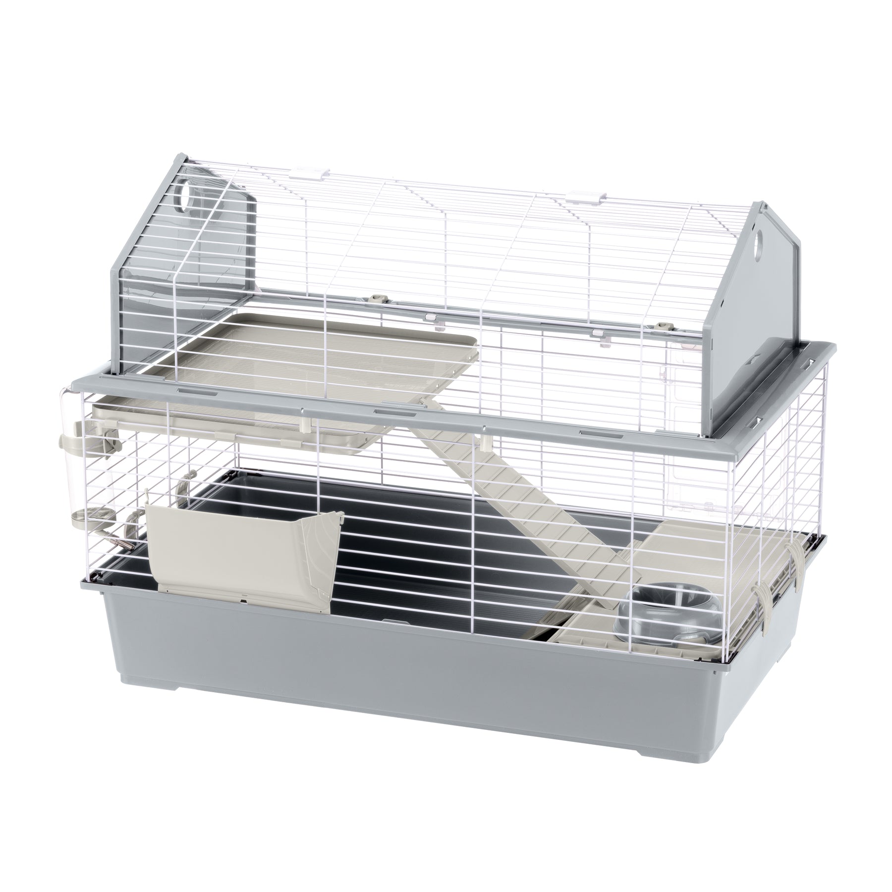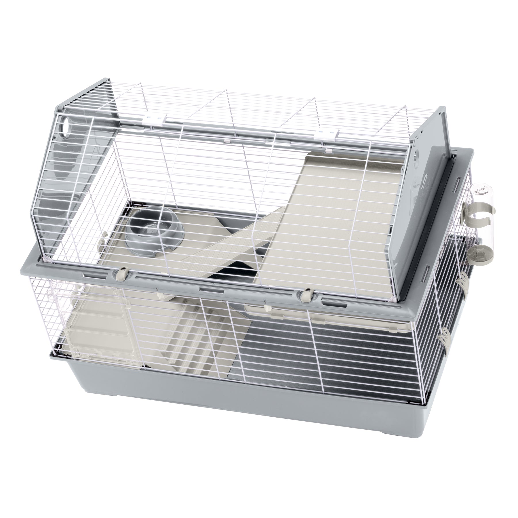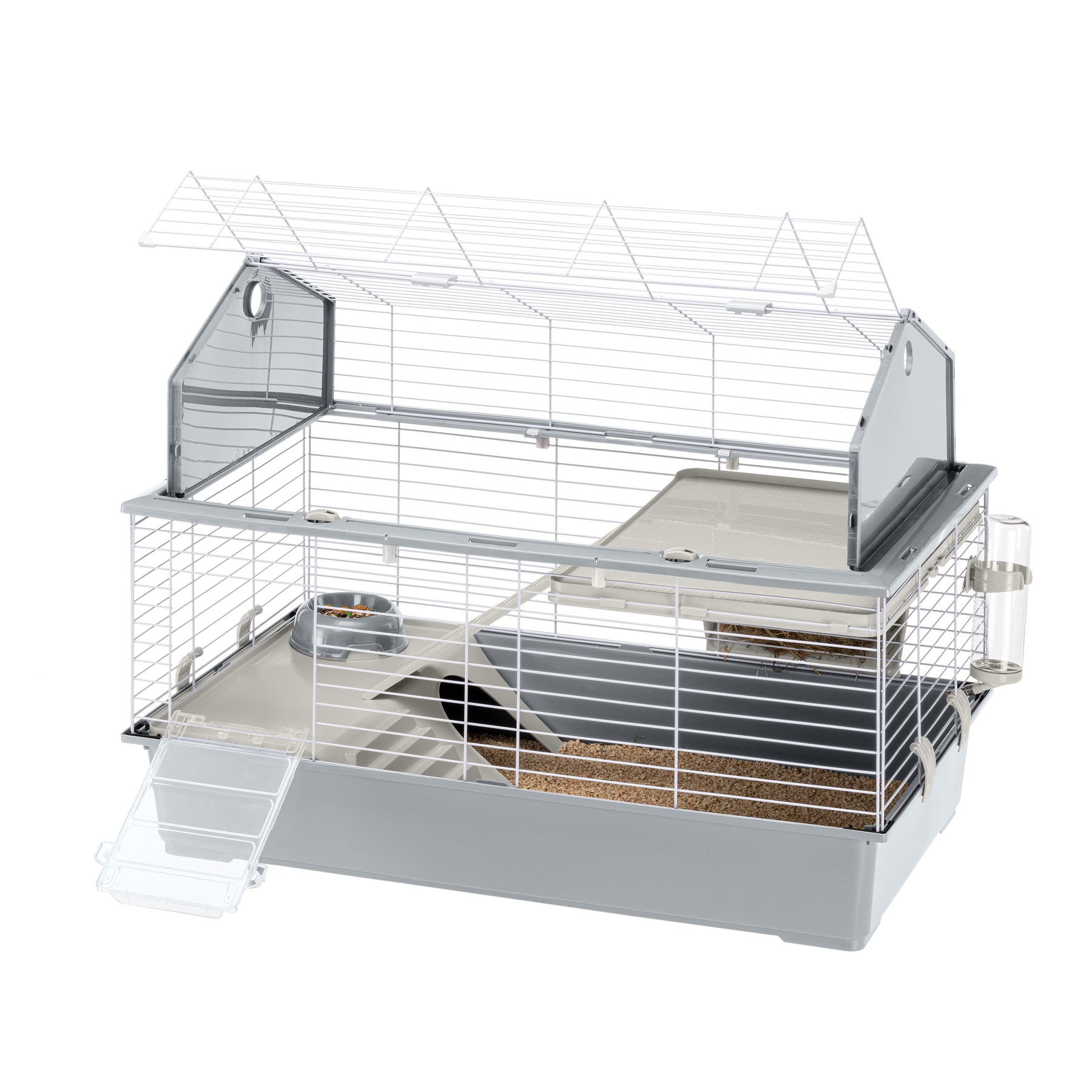 The cage, which can be completely disassembled, keeps the volume reduced, and is made of sturdy painted metal mesh with a thermoplastic resin base to effectively contain dirt, litter and food residues. On the front, a comfortable ladder allows the small animal to go out and enter independently.