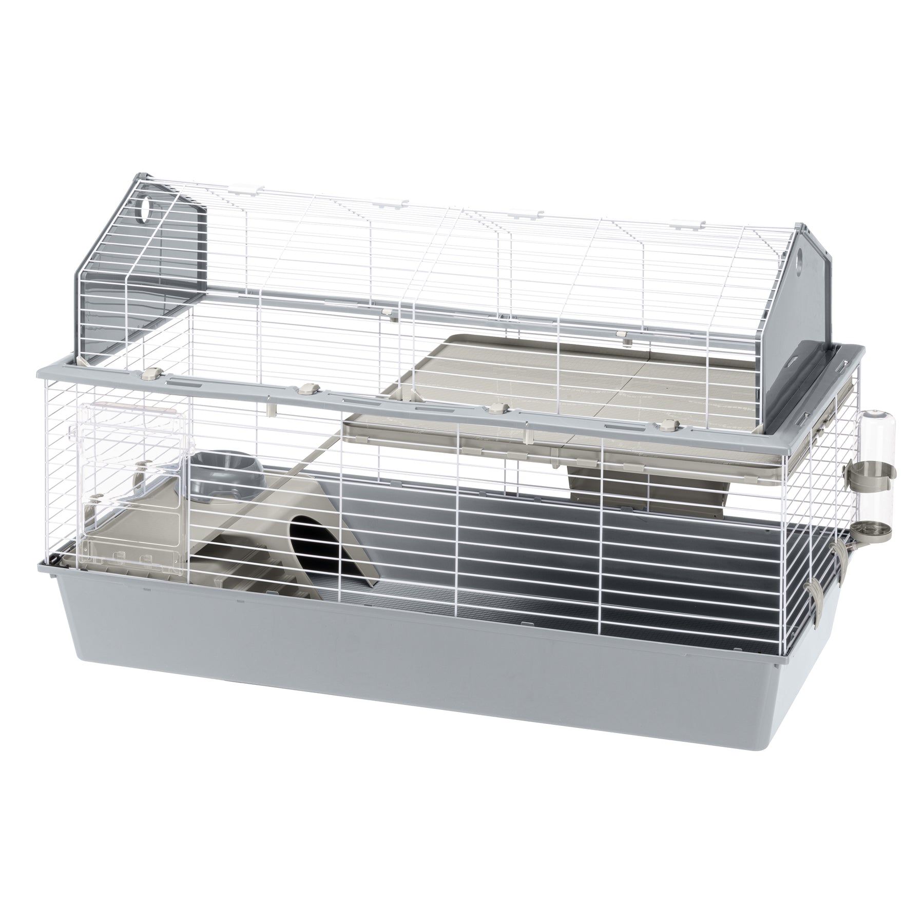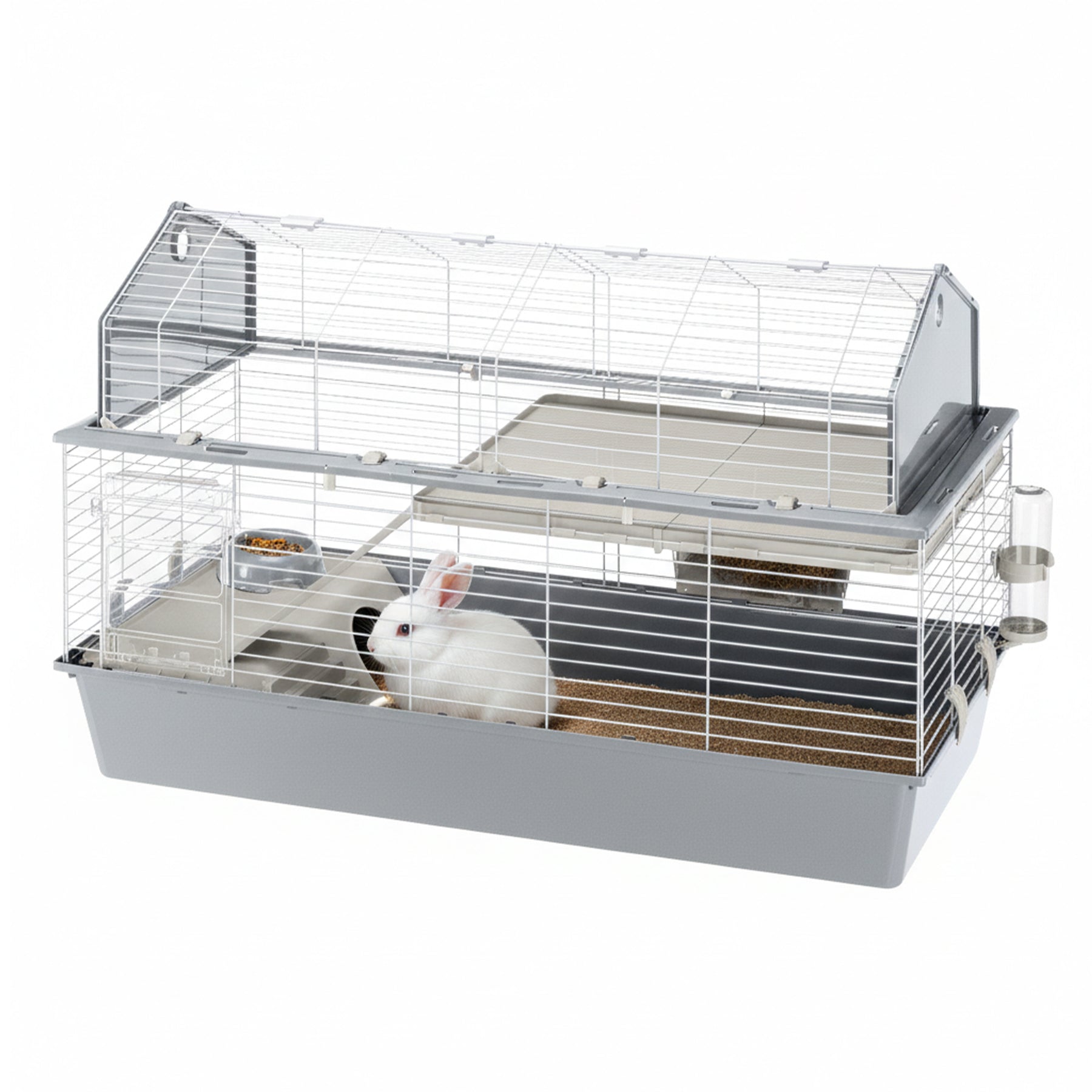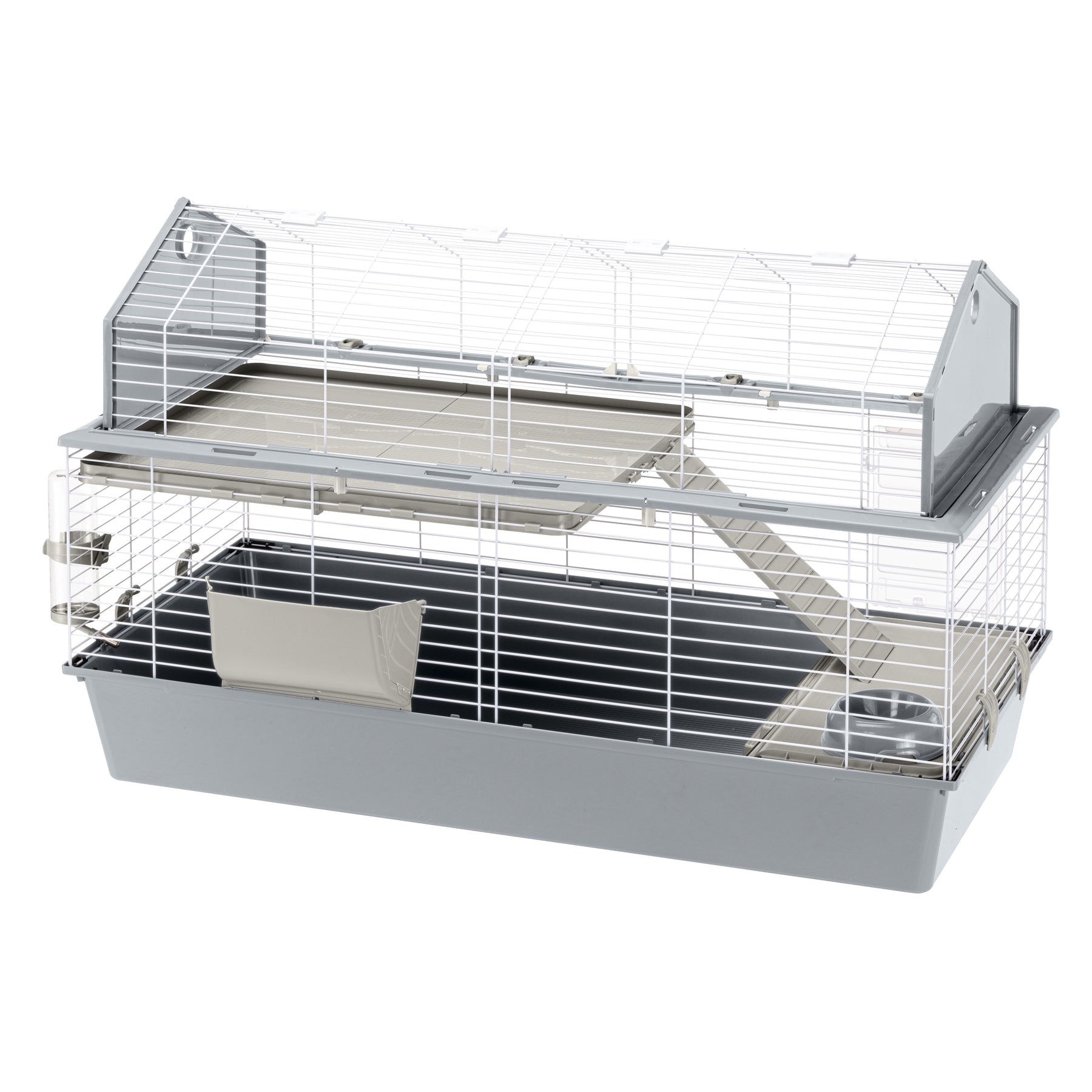 - Accessories included: 1 feeder, 1 drinking bottle, 1 bowl, 1 rabbit nest, 1 shelf with ladder