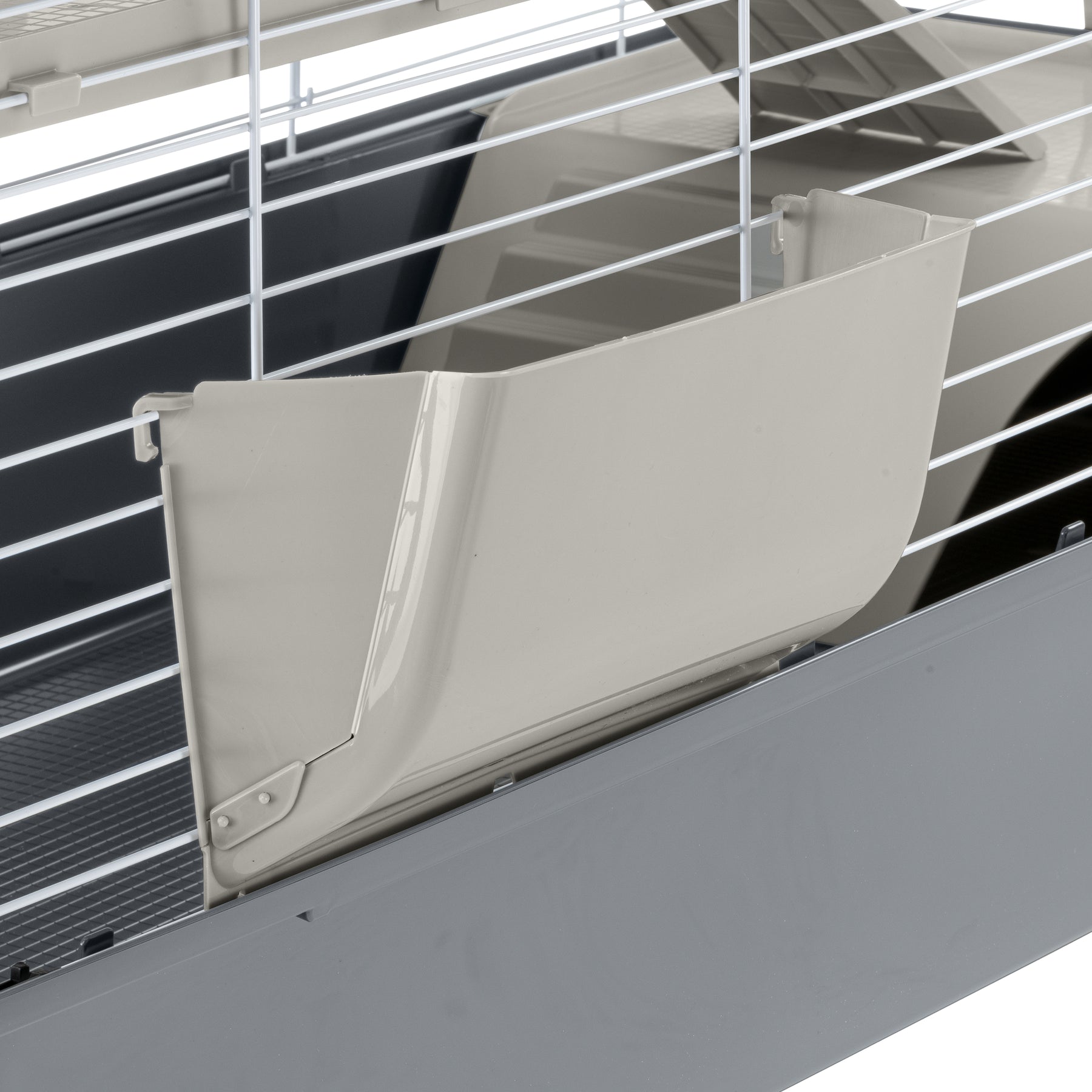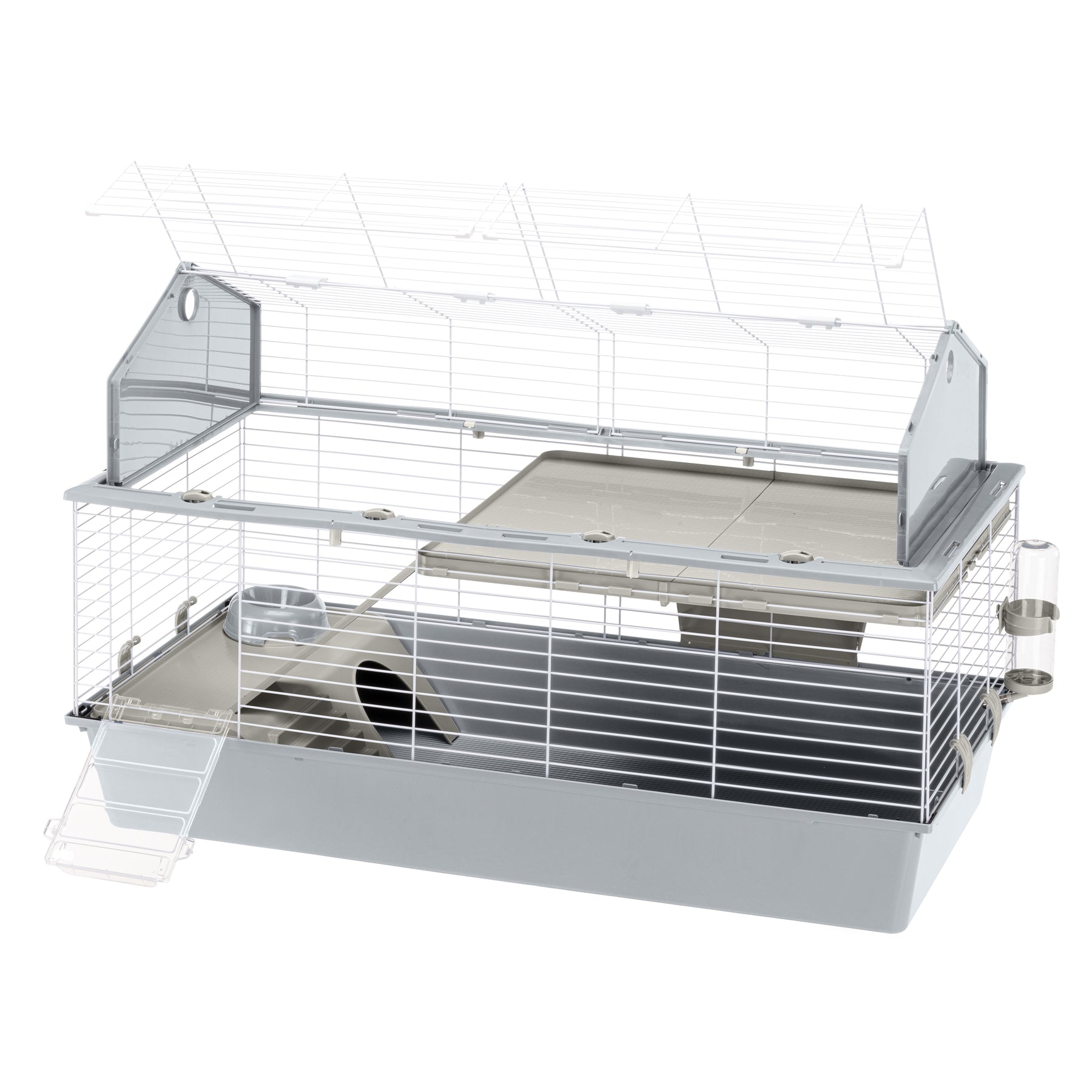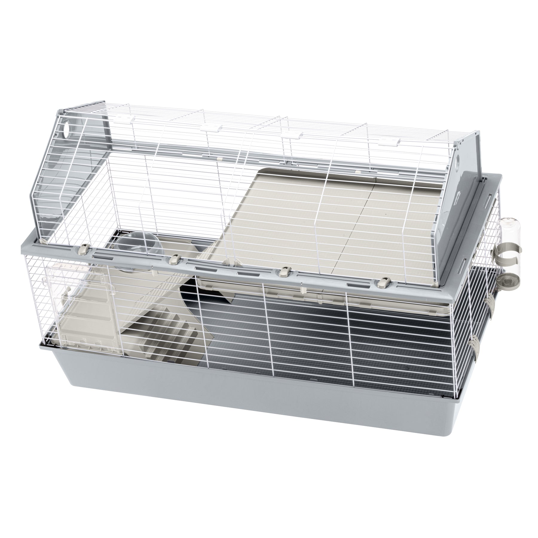 Sturdy and solid, the cage is made of painted metal mesh with a roomy thermoplastic resin base that effectively contains dirt and litter, preventing it from spilling out. On the front, there is a practical sliding door with a safety locking system designed to ensure your pet’s protection. The roof can be fully opened, allowing total access for daily maintenance and cleaning, and is equipped with secure locking clips. For deeper cleaning, the bottom and roof can be completely separated by releasing the side clips.