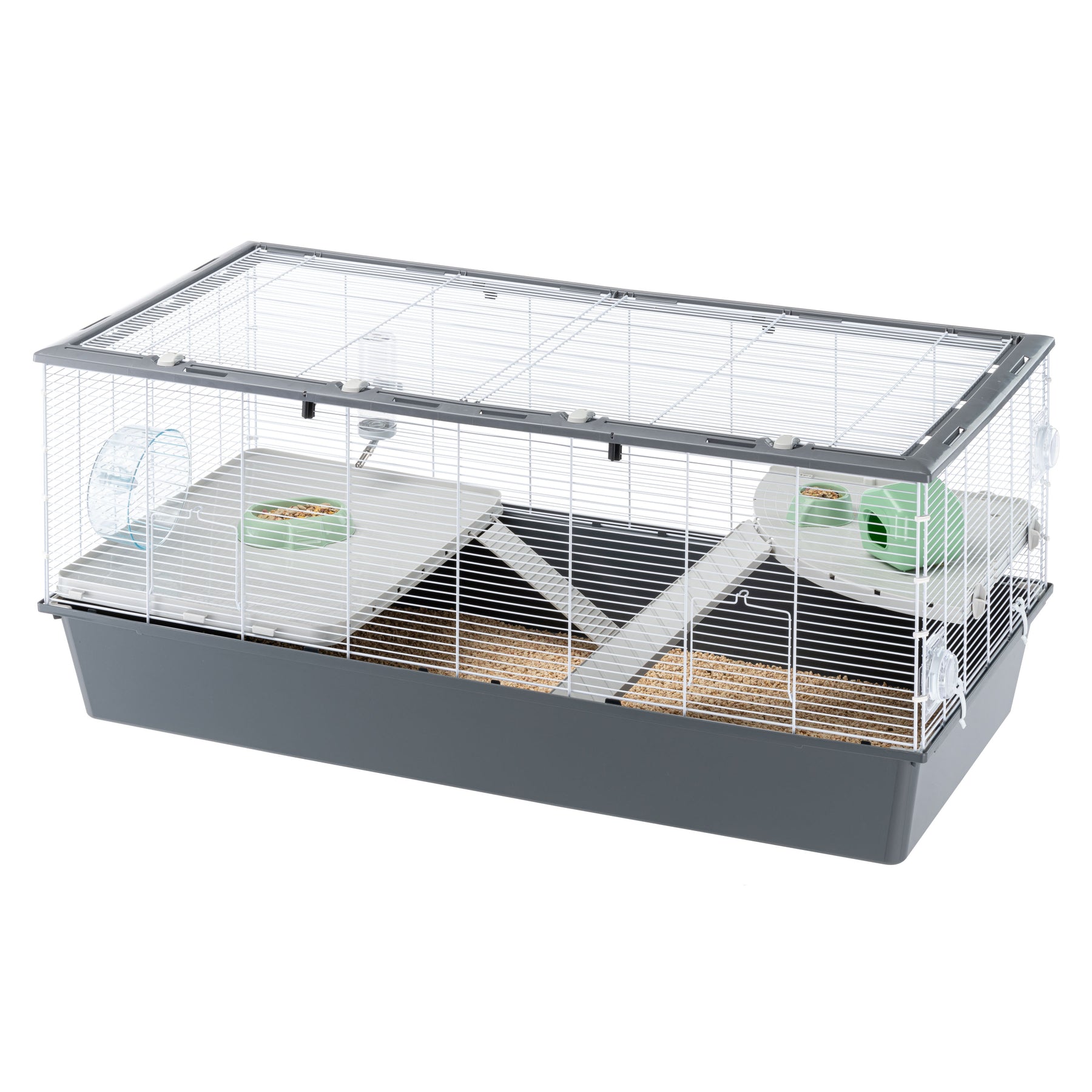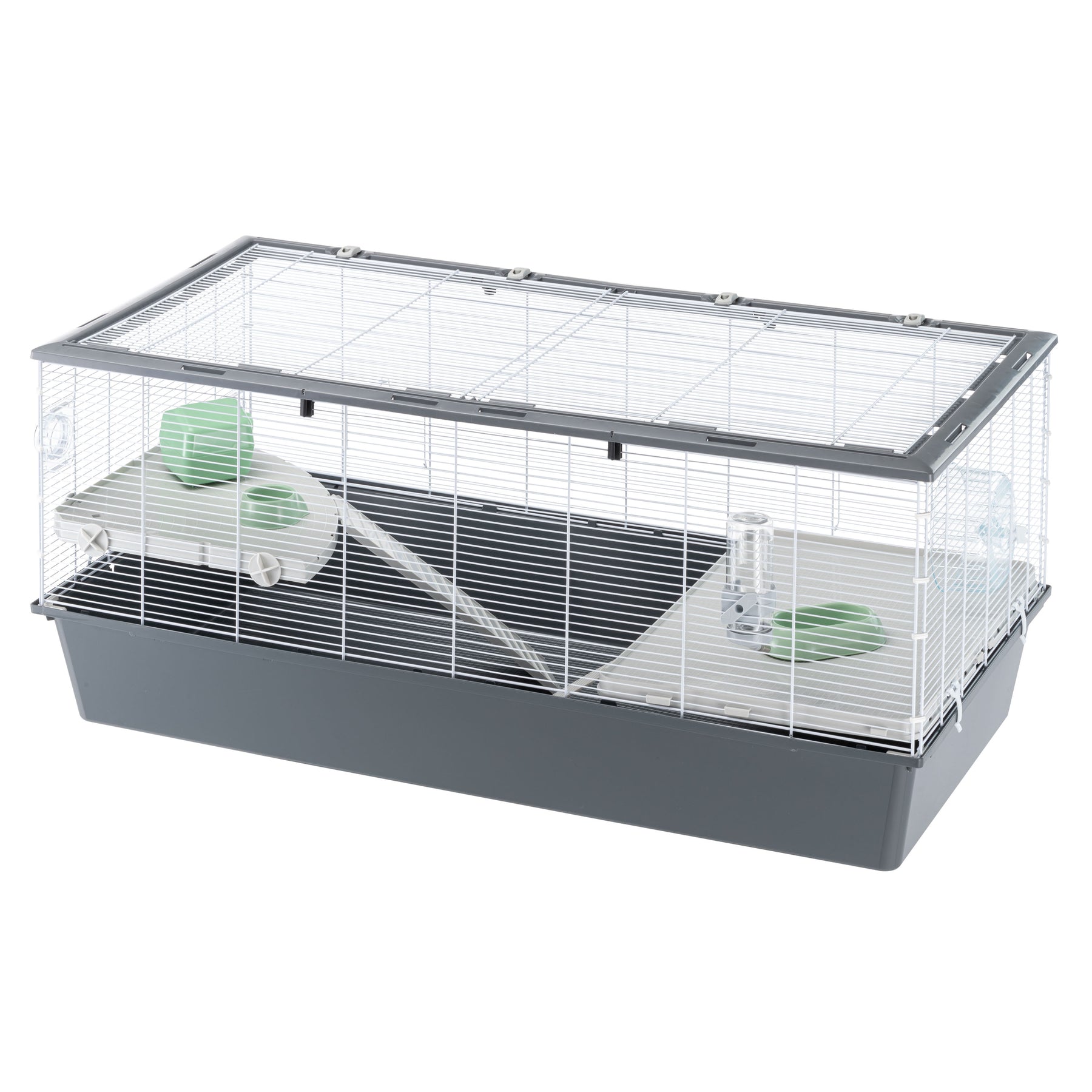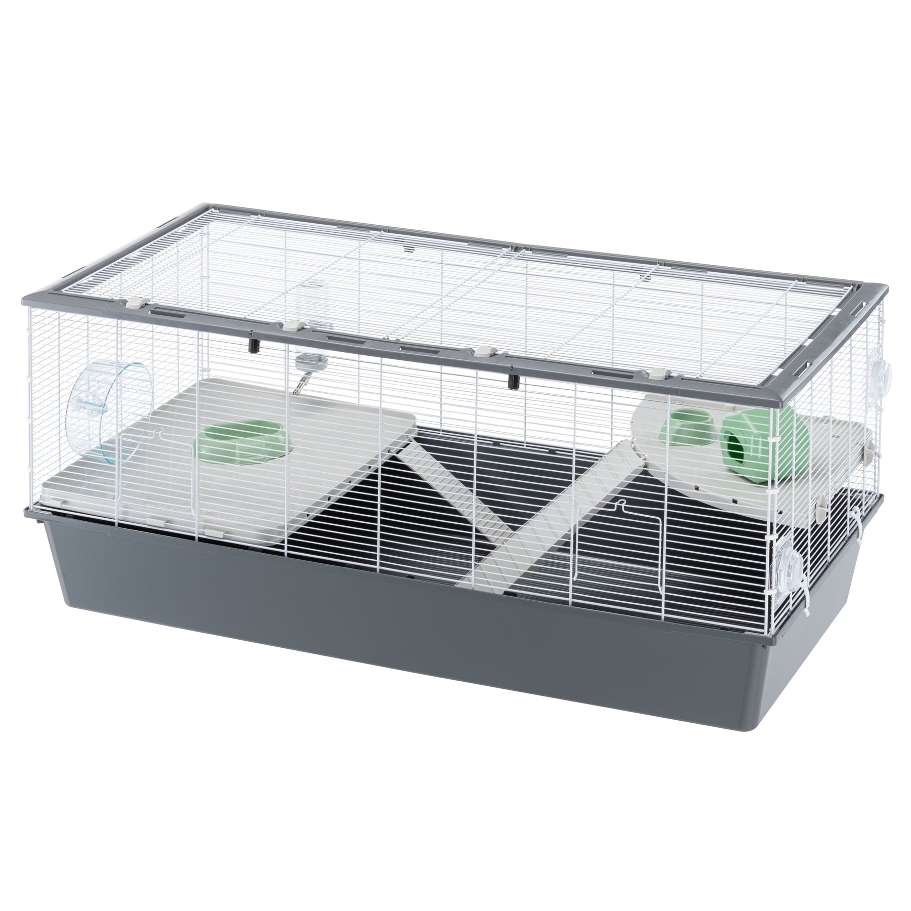 Criceti 120 comes complete with accessories that are indispensable for the animals' well-being: an exercise wheel, a feeder, a food bowl, a resting nest and a drinking bottle with stainless steel spout to ensure water is always available. The included accessories can be positioned freely within the cage, adapting to your little friend's habits.