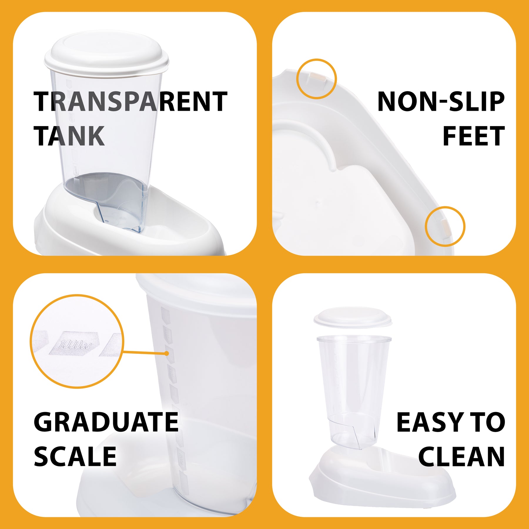 It is made of durable plastic and has a transparent tank, making it easy to see when the water is running out. The non-skid rubber stoppers on the bottom rim ensure maximum stability and it is also easy to clean, thanks to the removable lid. The Nadir water dispenser for cats and dogs holds a maximum of 3 litres of water.