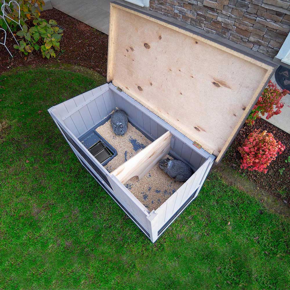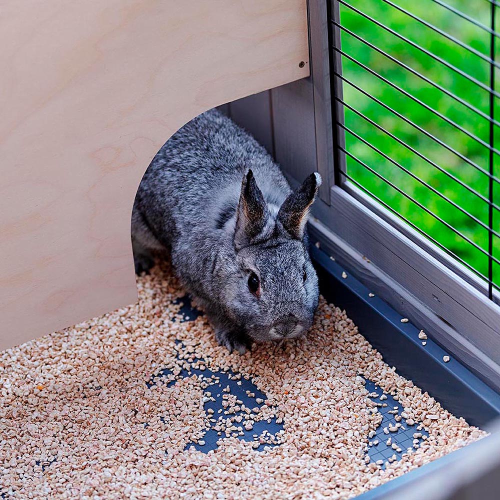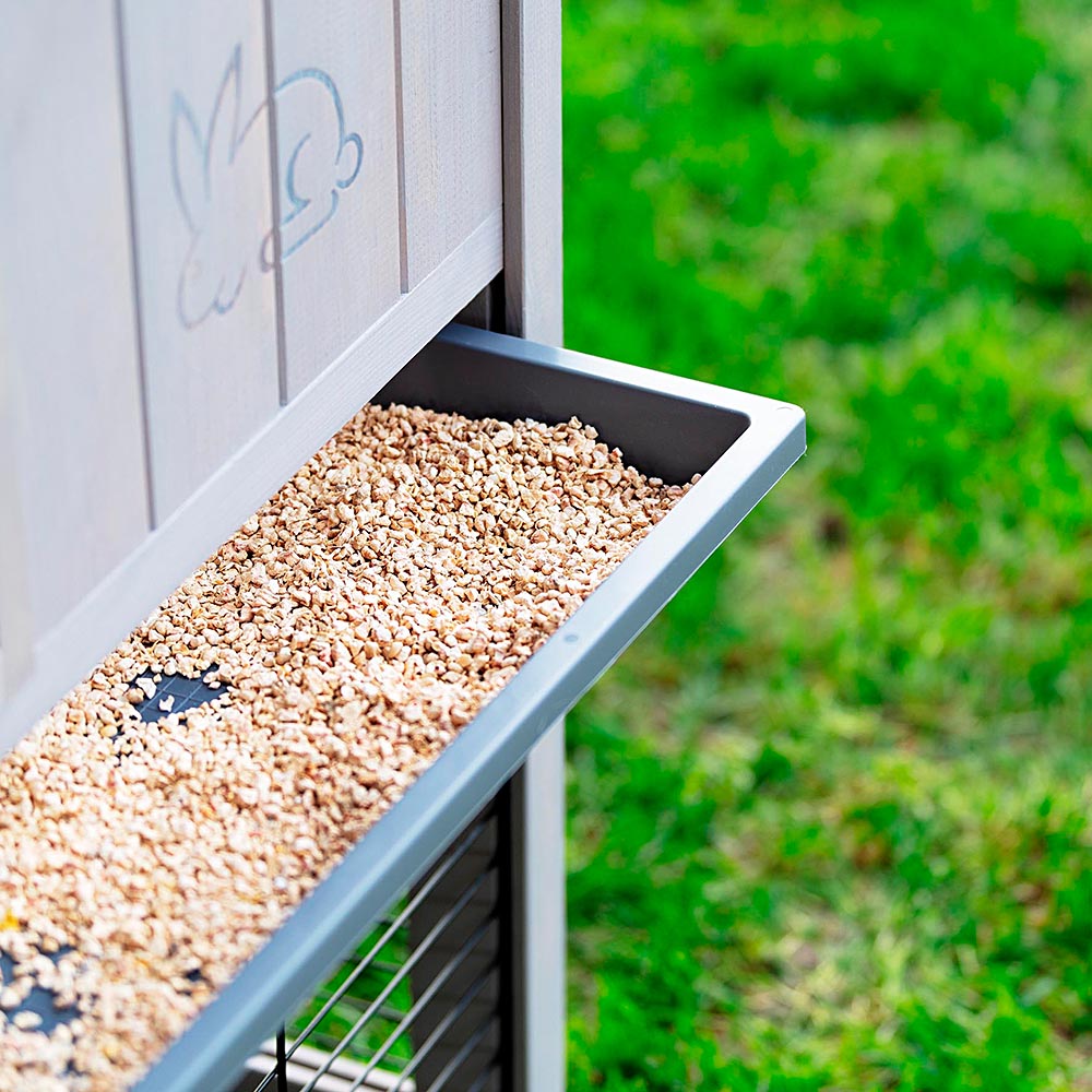 The roof is flippable for easy maintenance and to pick up your rabbit when necessary. For easy cleaning, the two roomy poo trays can be removed and are kept hidden from view thanks to a flippable wooden door that can be locked in place using its own hooks. The opening that gives access to the lower floor is equipped with a closing lid, very practical during cleaning, and with a higher edge to keep the litter from spilling.
