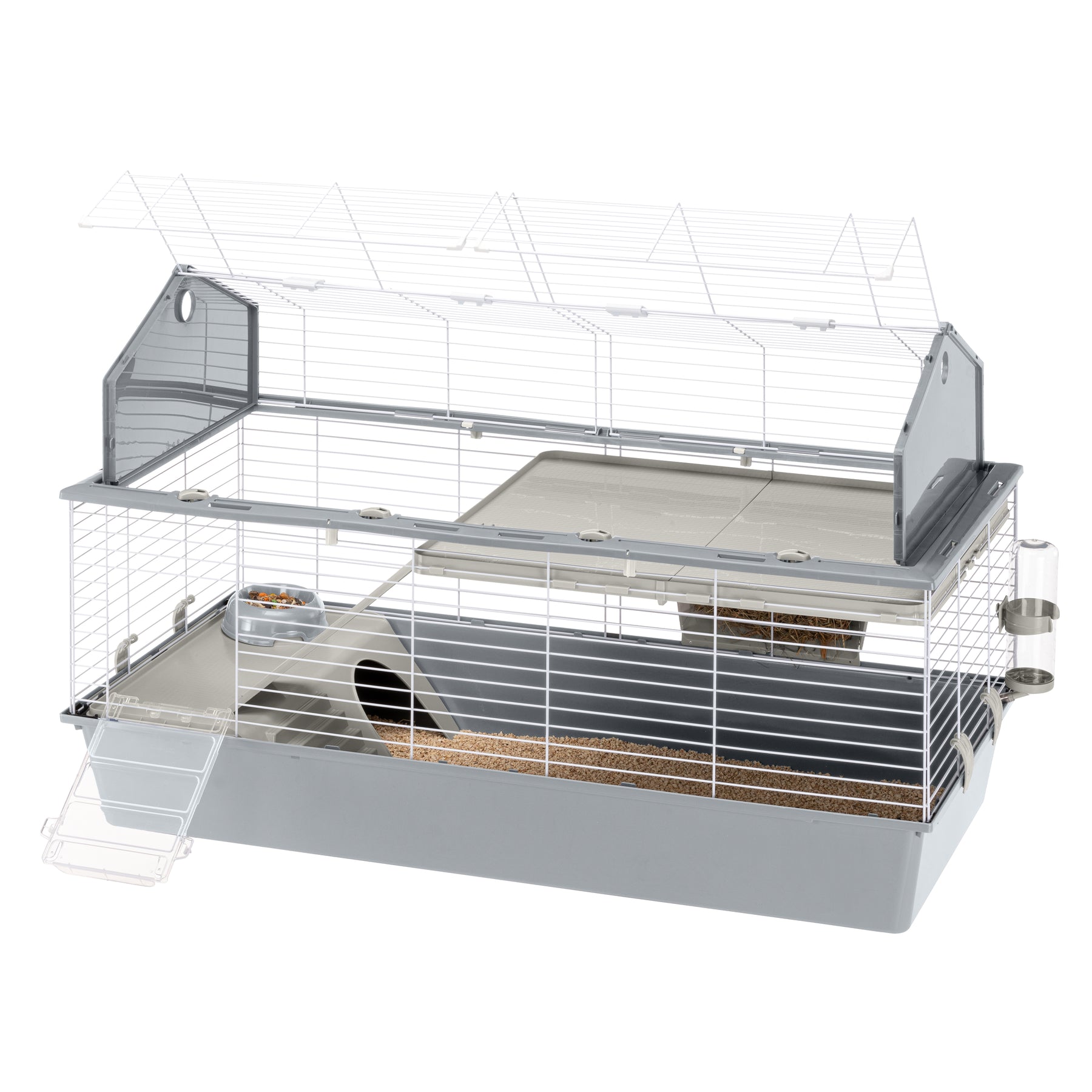 This spacious habitat provides a large living area, offering your pet maximum comfort. Equipped with practical accessories such as feeder, bowl, and drinking bottle, it features on the lower level a cozy relaxation area complete with a plastic little house. The upper floor includes an additional living zone, easily accessible by a convenient ladder.
