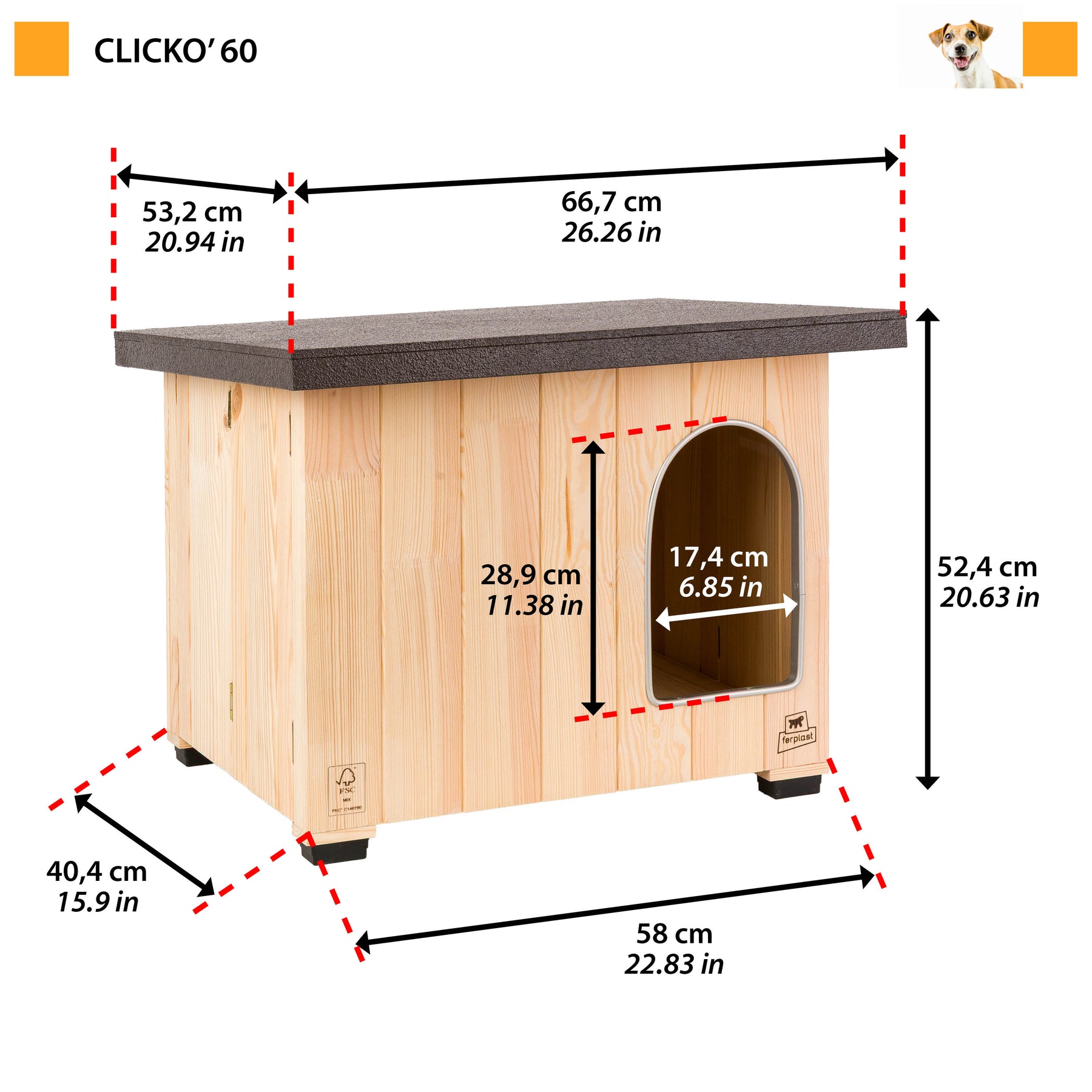 The boards are secured with screws, preventing gaps and reducing air infiltration, keeping the interior dry and well protected. The FSC™-certified wood, sourced from responsibly managed forests, guarantees a natural and sustainable product of superior quality. The entire structure is treated with water-based, non-toxic and odour-free paints, safe for your dog’s well-being, while a specific protective coating shields the wood from UV rays. The sloped roof is treated with waterproof resin, ensuring effective protection from rain and humidity.