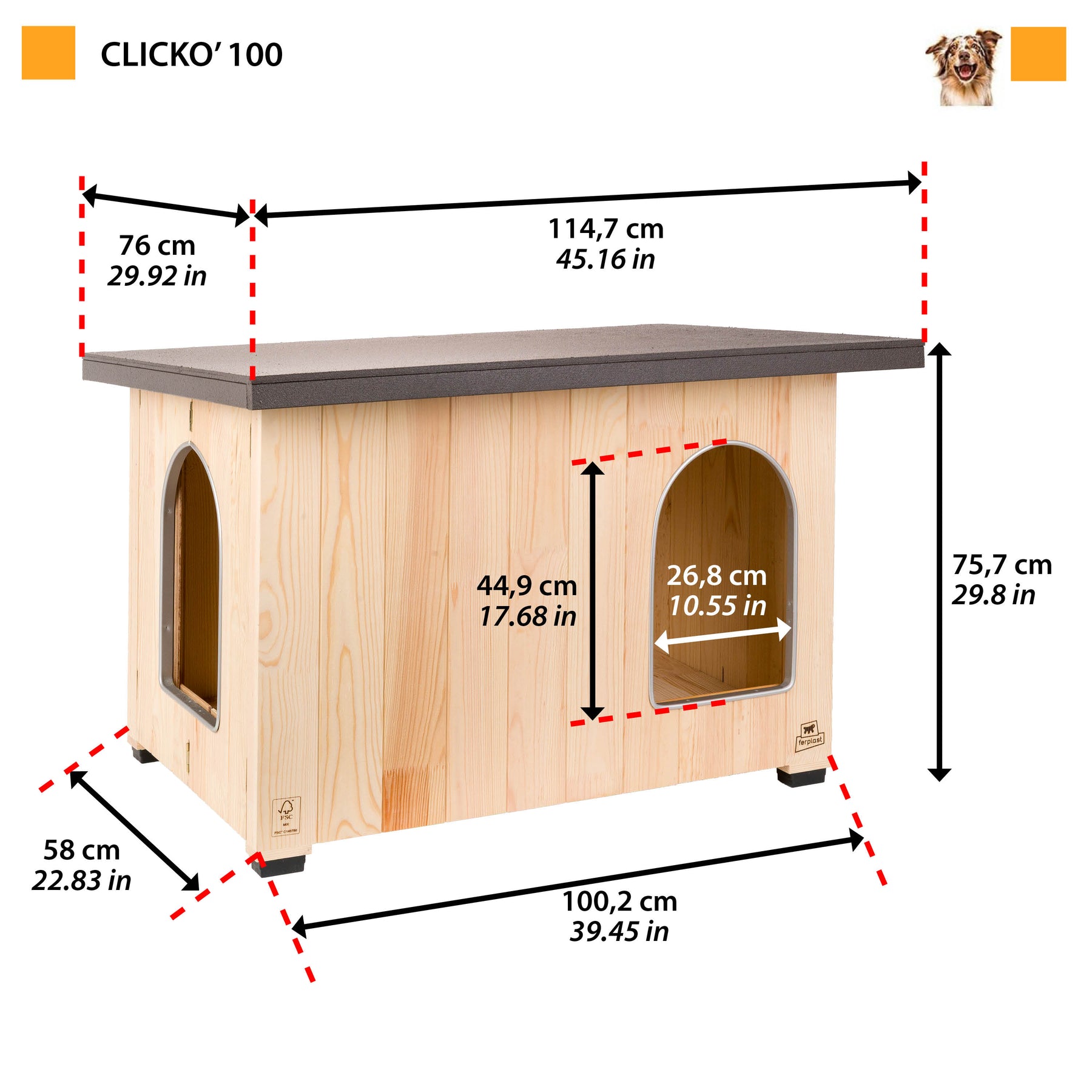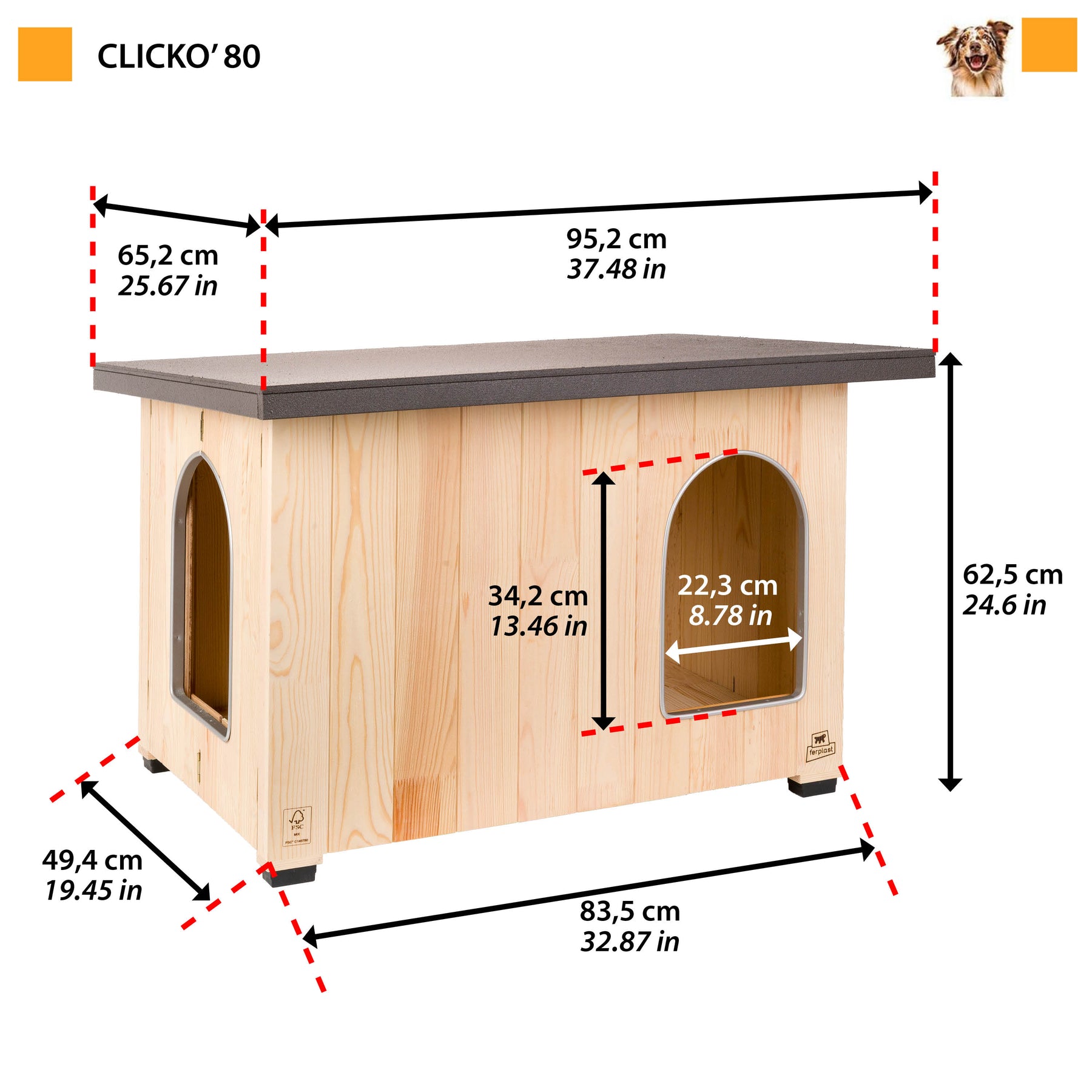 Clickò is an outdoor wooden dog kennel designed to offer immediate assembly, comfort and long-lasting protection in any season. Its innovative self-assembling structure opens with a single gesture and requires no tools, making it ideal for anyone looking for a sturdy wooden dog house ready to use straight away. Made from high-quality Nordic pine, it ensures excellent durability, stability and insulation.