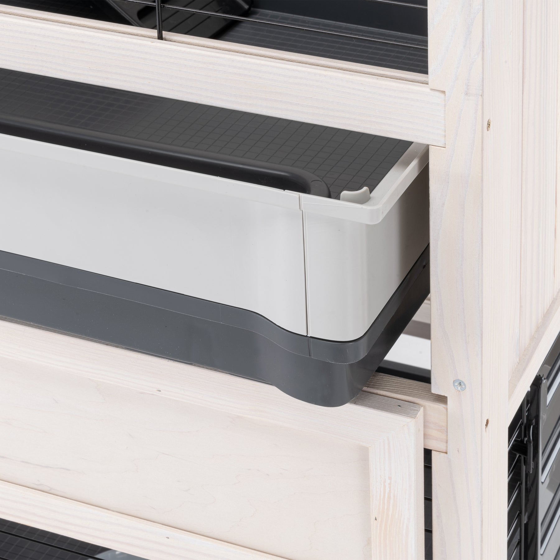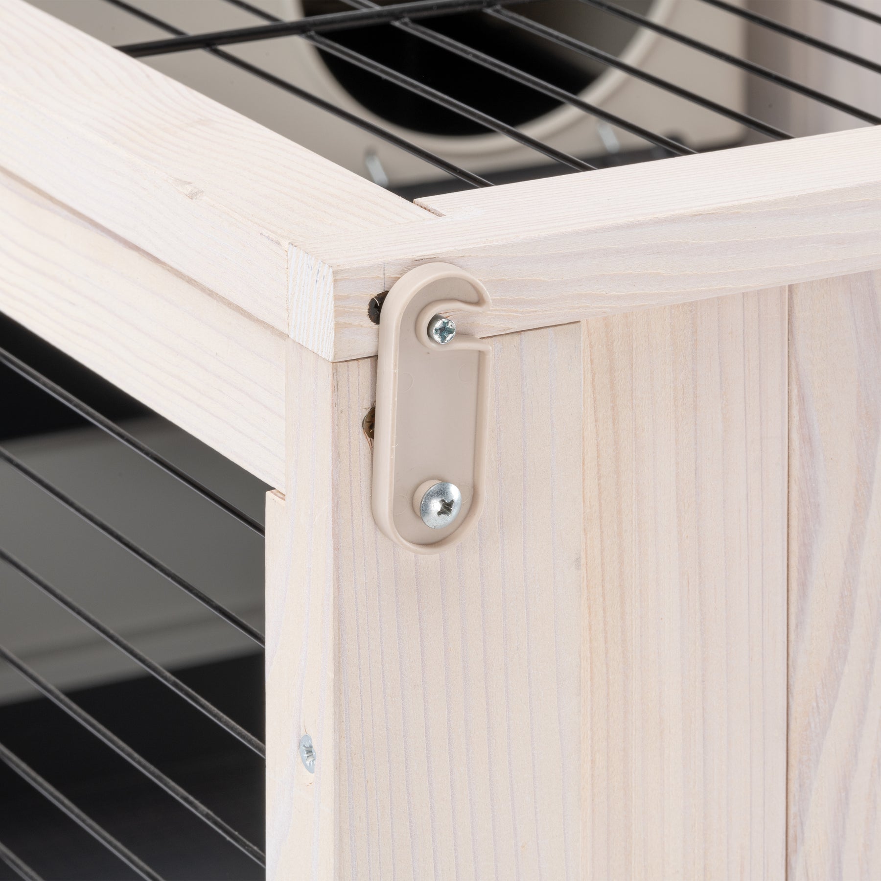 The top floor provides a quiet and sheltered resting area, complete with a deep plastic base ideal for holding litter and a comfortable rabbit house.