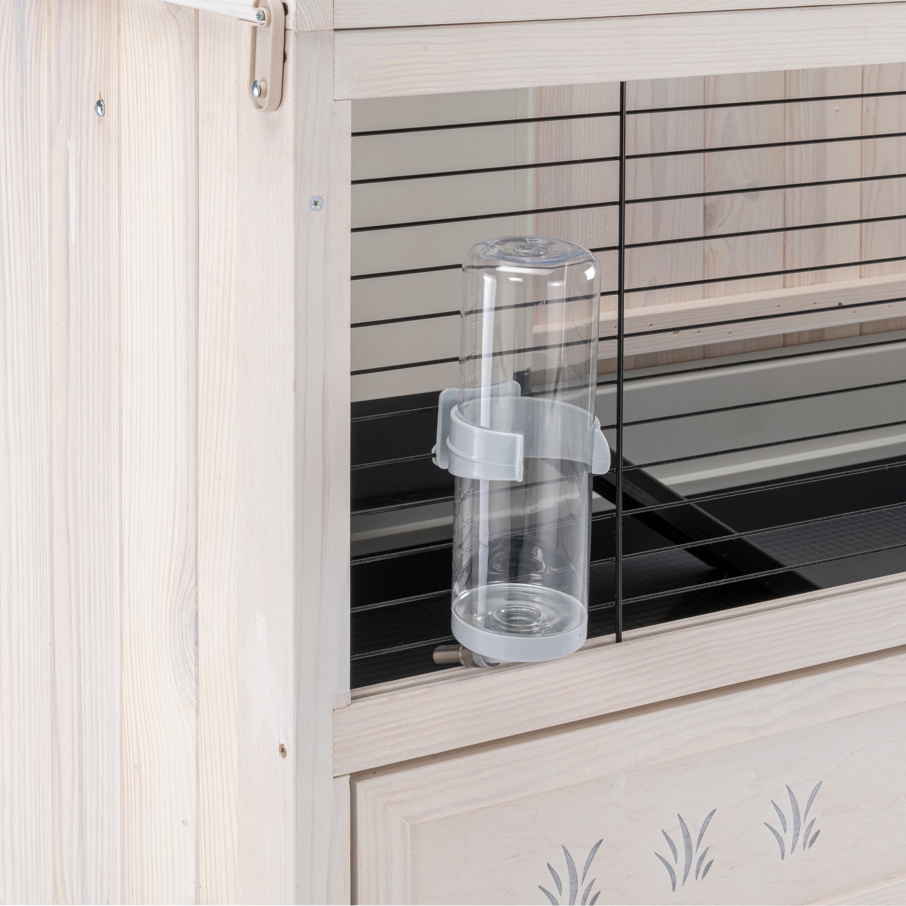 The pen is equipped with accessories such as a drinking bottle, a bowl, and a plastic hay feeder, together with a sturdy ladder that connects to the upper level.