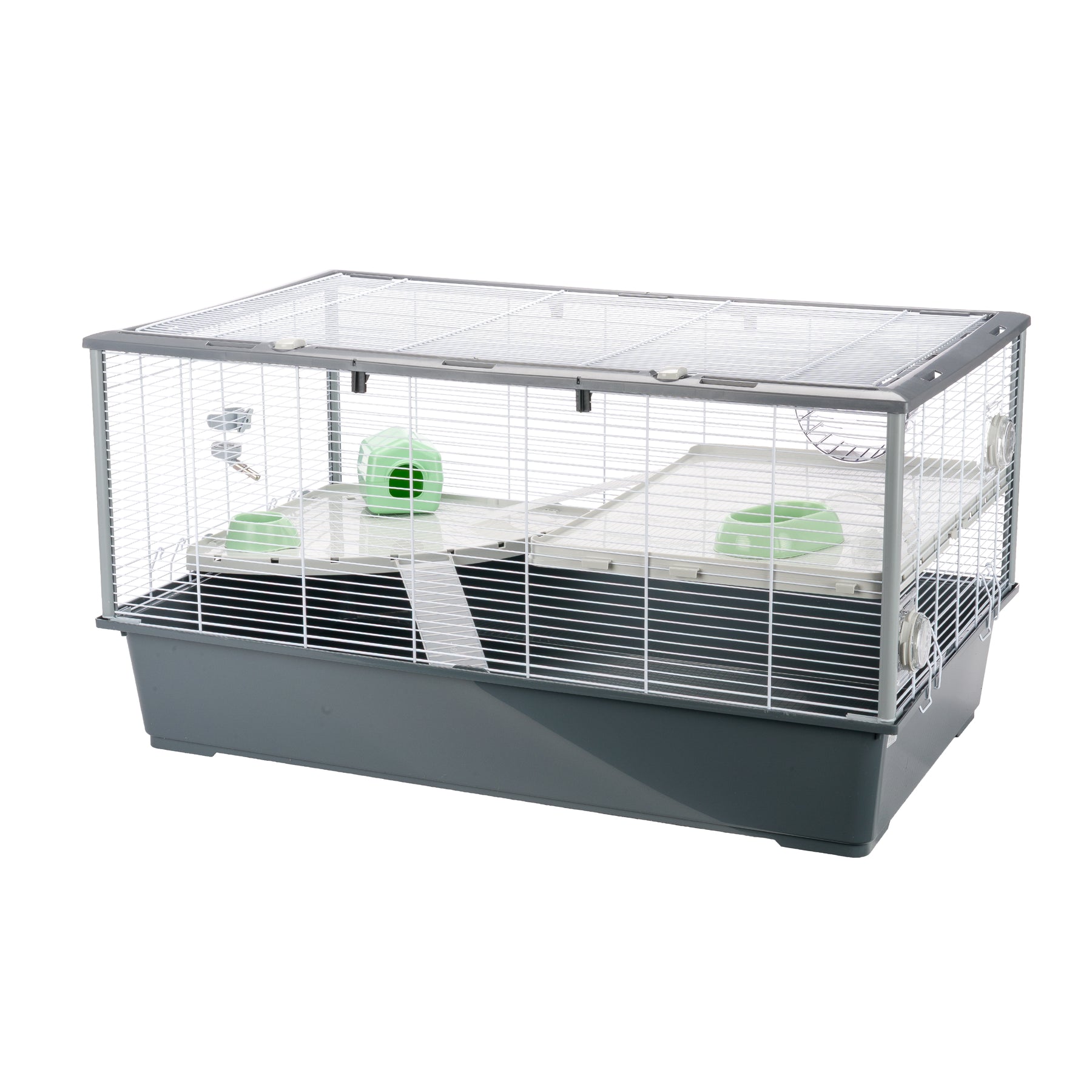 Criceti 100 is a hamster cage built with high-quality materials: the metal mesh is varnished, while the structure has plastic columns and frames for extra solidity and sturdiness. The upper part has an easy-opening, wide and practical grid for easy access to the internal part when it comes to maintenance. Safe for your pet, the grid can easily be locked thanks to the rotating safety hooks. The bottom part, the top part and the grid can be easily detached to make cleaning easier.