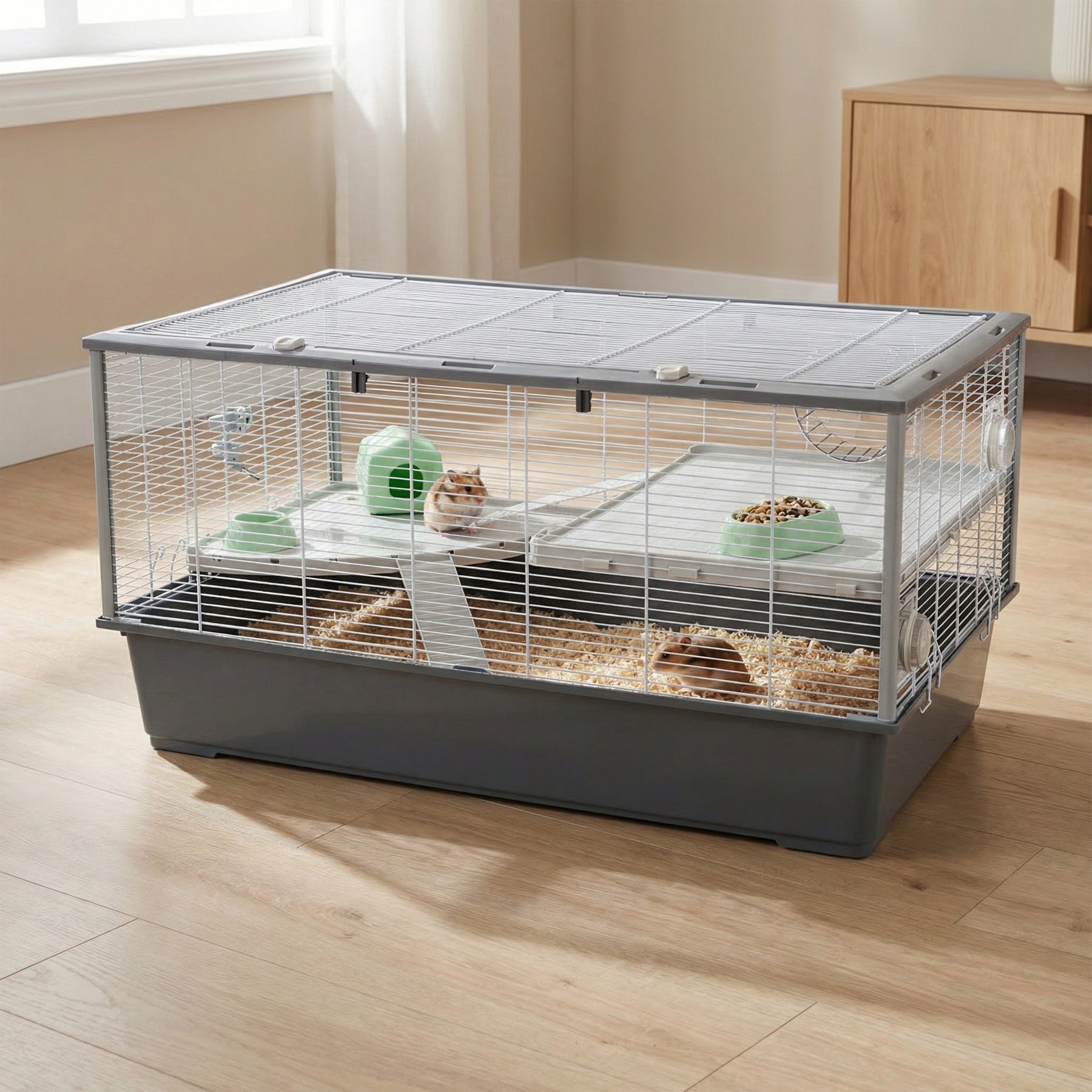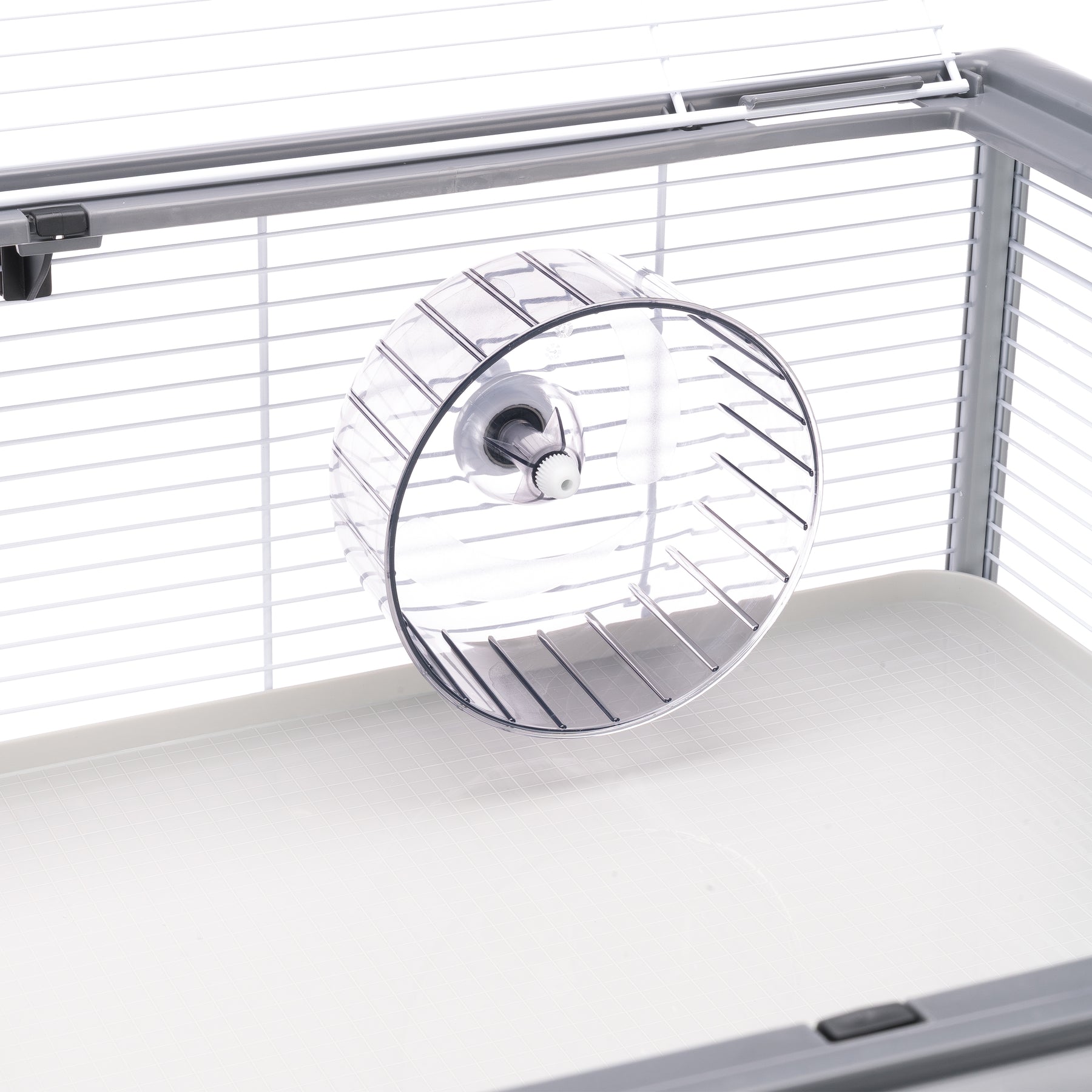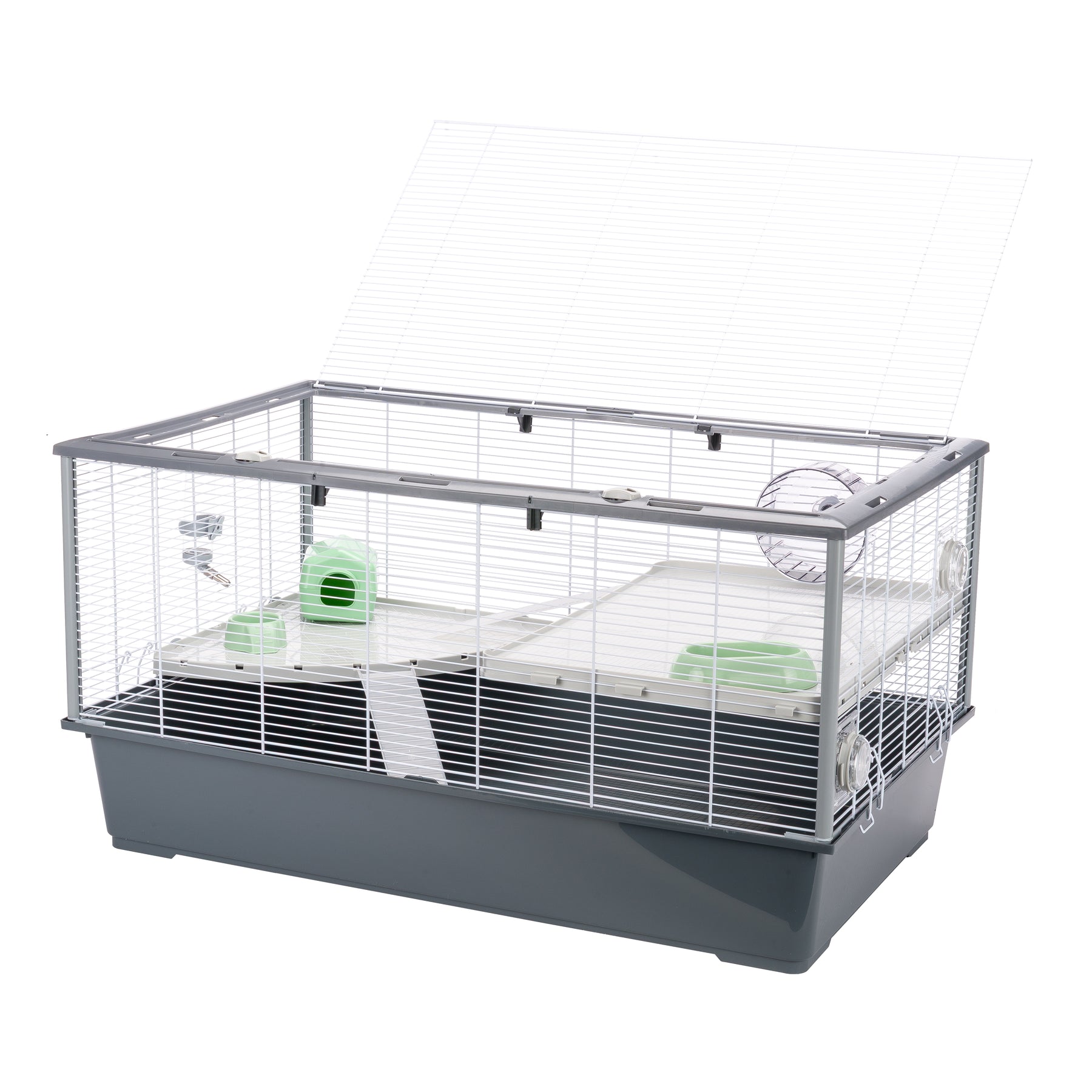 - Accessories included: 2 food bowls (large and small), 1 water spout, 1 nest-house, 1 hamster wheel, 2 floors, 2 sets of stairs