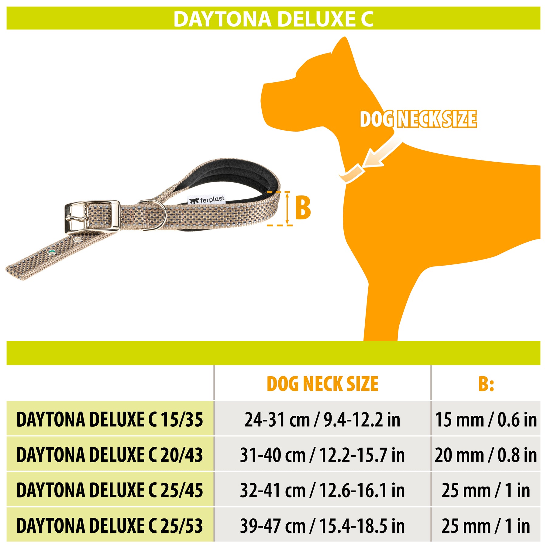 The Daytona Deluxe collars are available in different colours and sizes that differ in circumference (from 27 to 53 cm) and in tape width (from 15 to 25 mm).