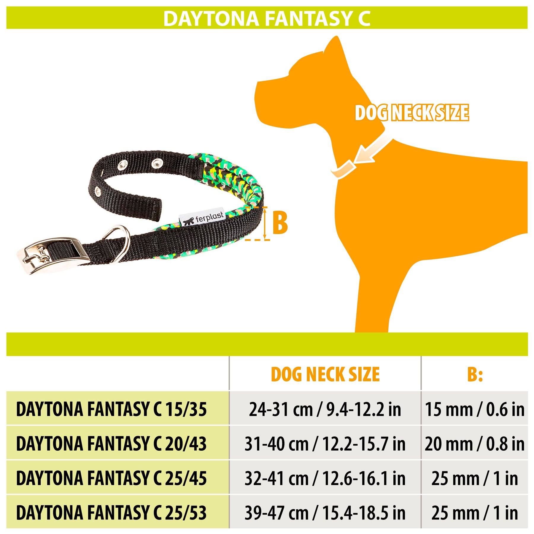 Very comfortable on your friend's neck, the nylon dog collar Daytona has a four-hole regulating system with a metal buckle. Thanks to the internal padding, it's very soft and comfortable on your animal's neck. The range of Daytona collars proposes many different versions: these models Fantasy, for example, available in four sizes, distinguish for innovative patterns and color-matching.