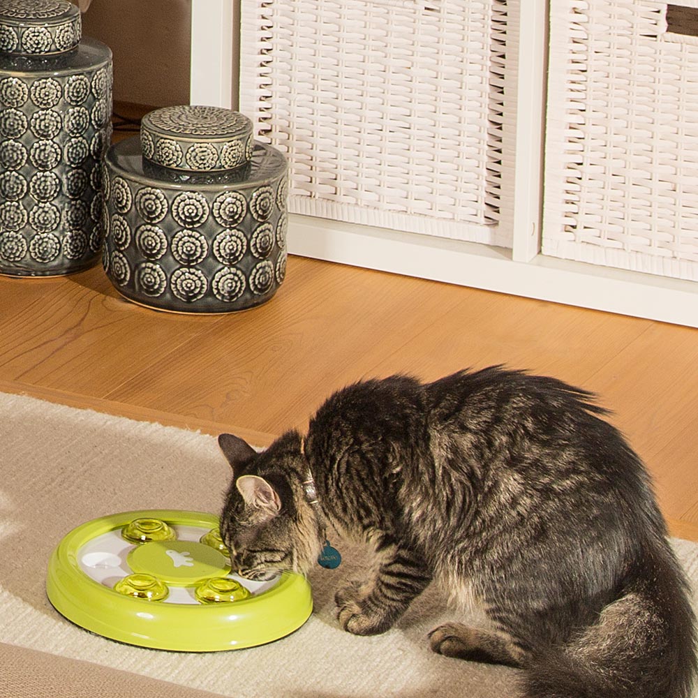 Discover is an interactive cat toy that will keep your feline entertained, to keep boredom at bay! An item of the Clever & Happy line of products, Discover was designed to stimulate your pet's predator instincts, forcing him to eat more slowly. Perfect to keep your cat in perfect health, this toy helps your cat do all the physical and mental exercise he needs. Playing together helps strengthen your relationship! Just place some treats in the holes and close the sliding lids: your cat will have tons of fun looking for them and enjoying them. If you prefer, use their favourite snacks, instead of cat food.