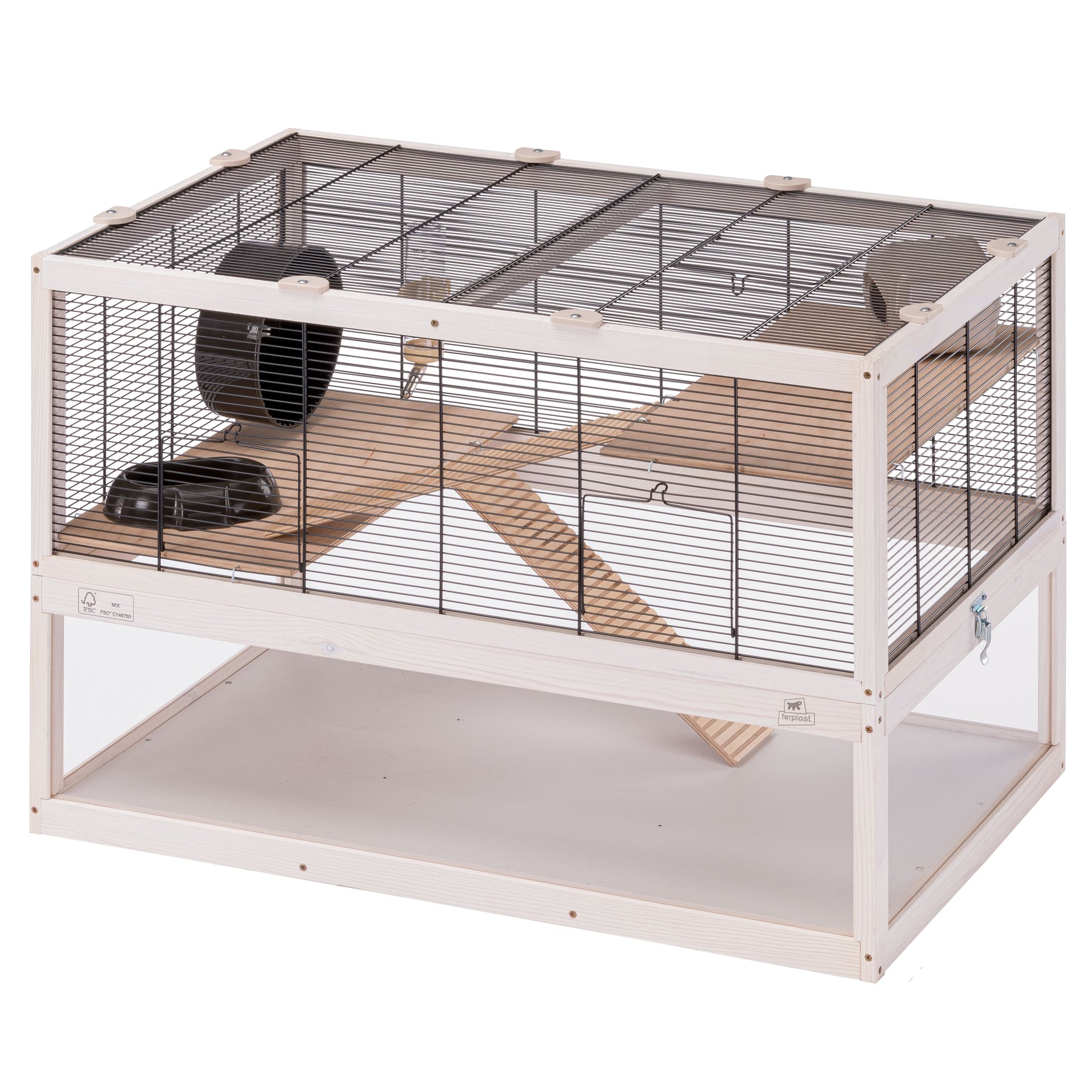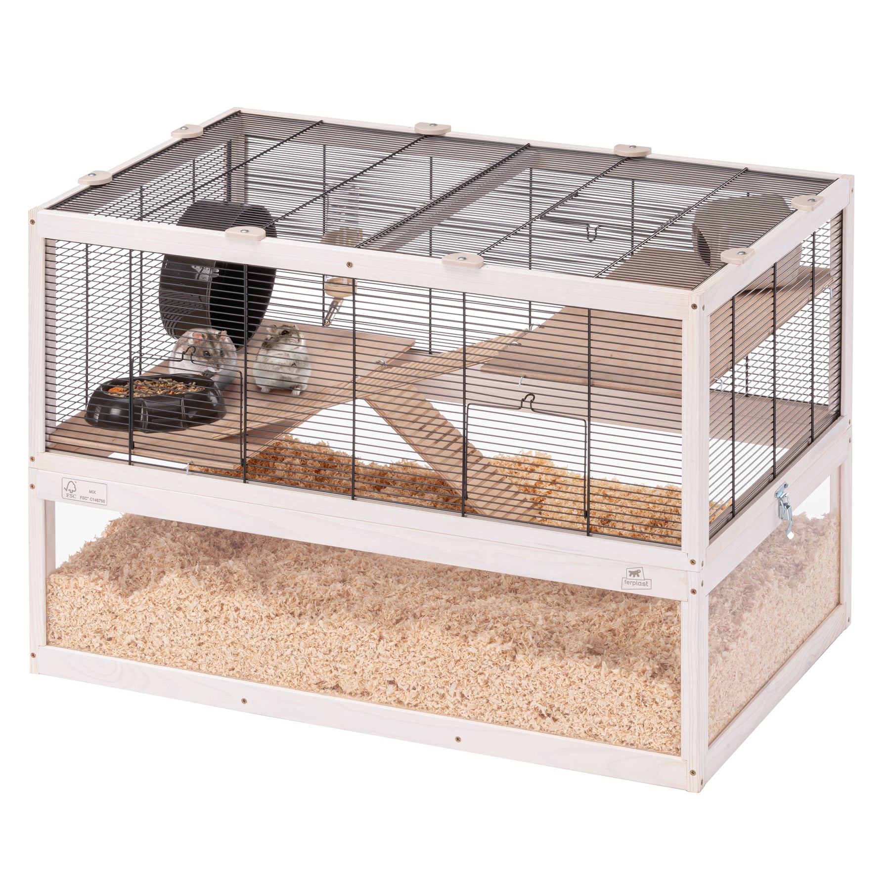 Included in each habitat you will find indispensable accessories such as a resting house, a wheel for keeping fit, a plastic feeder and a drinking bottle with stainless steel spout.