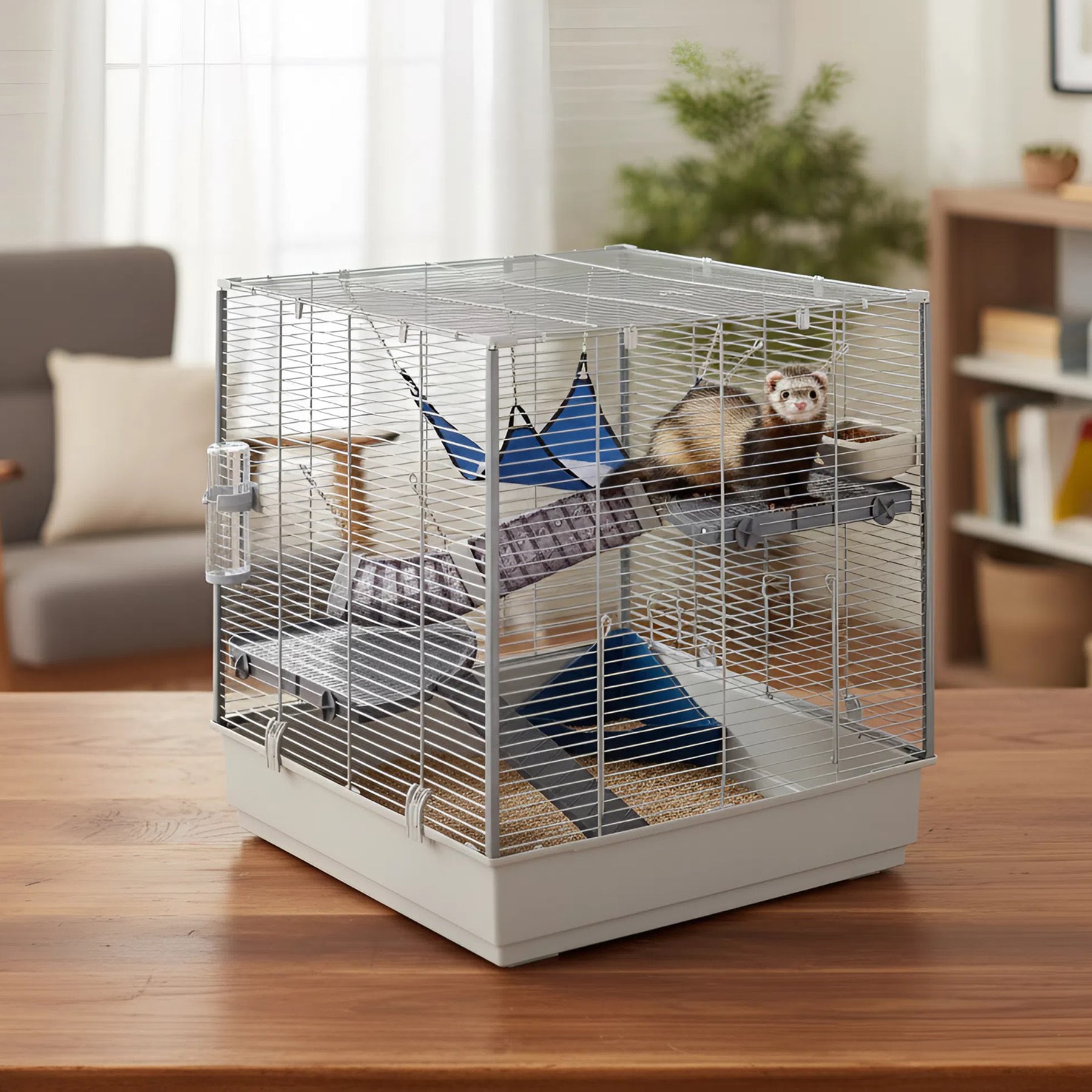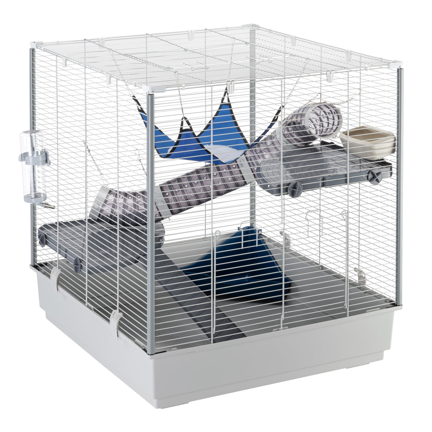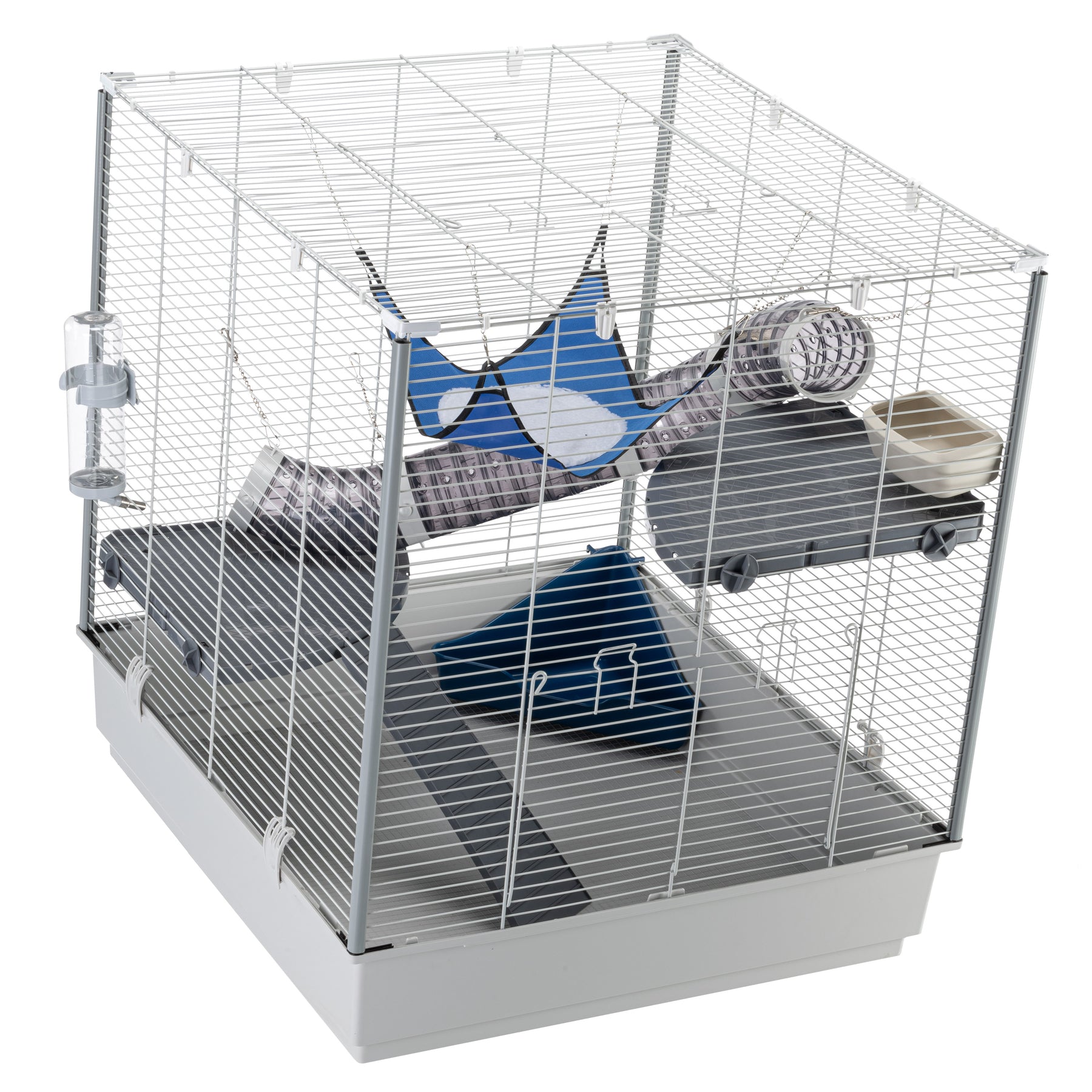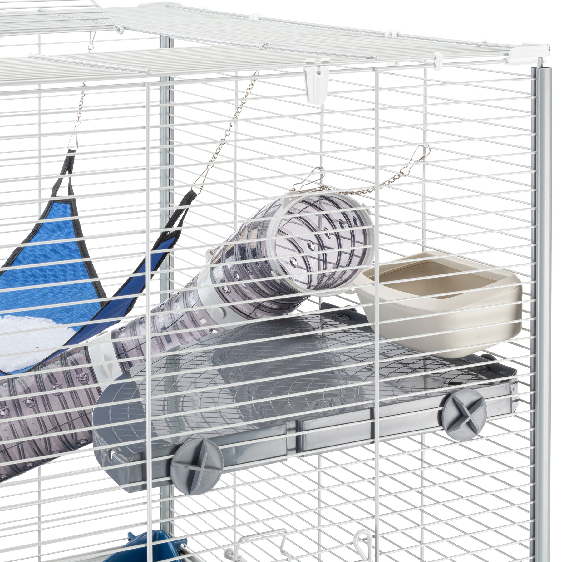 Accessories included: corner ferret toilet, plastic feeder, drinking bottle and cute hammock with metal chain for attachment. To let your little friend play, you will also find inside the habitat plastic tubes that can be hung and used to connect the various levels inside the habitat.
