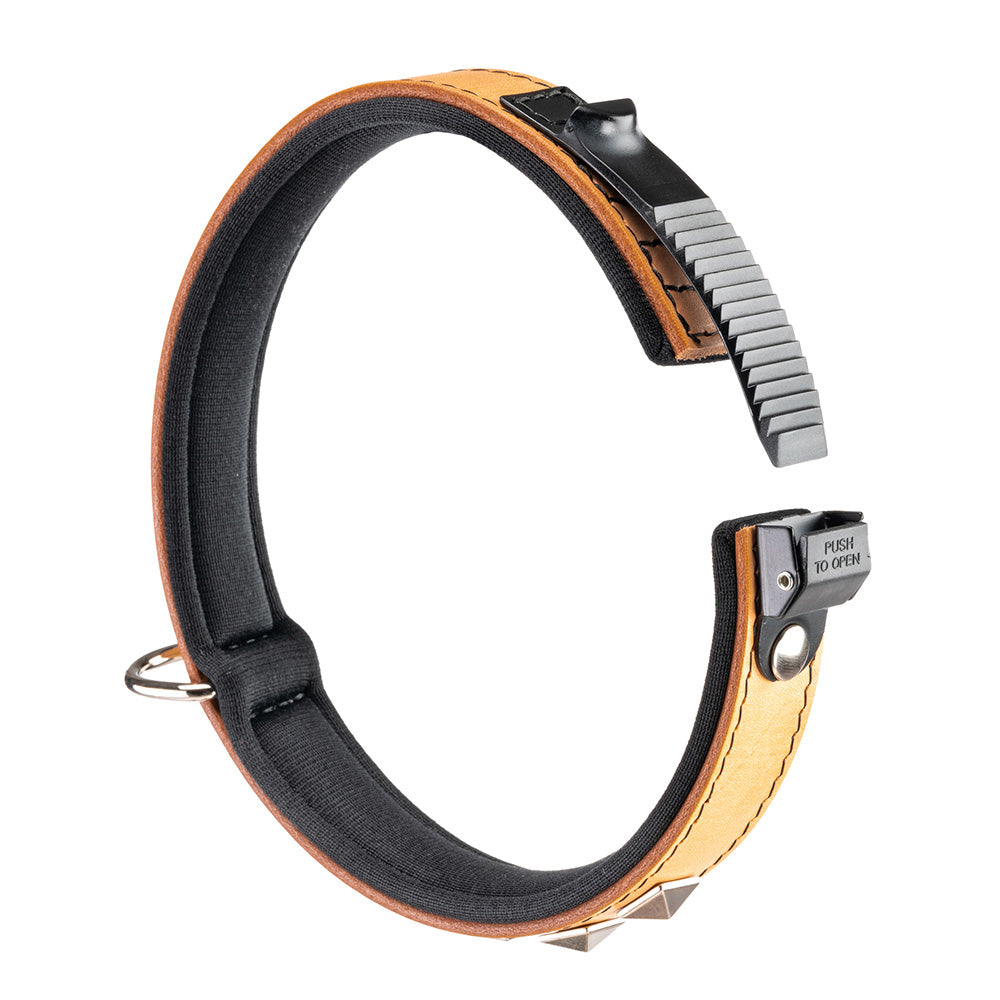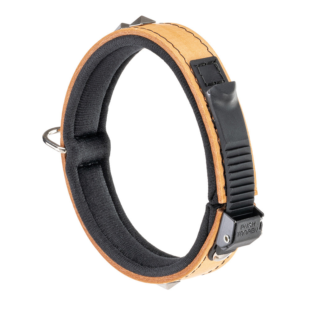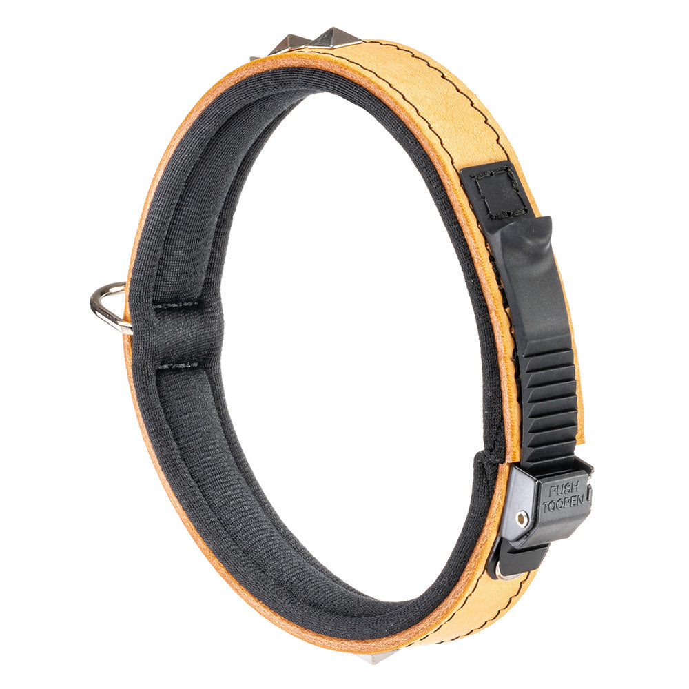 The leather dog collars Giotto have a perfect wearability thanks to the patented micro-regulation system and to their soft internal padding. This leather black-coloured version has some small metal applications with the shape of pyramids making it very original and captivating: perfect for dogs who want to distinguish from the others!