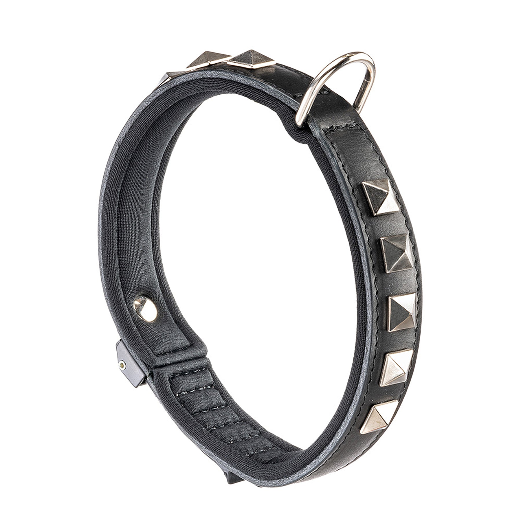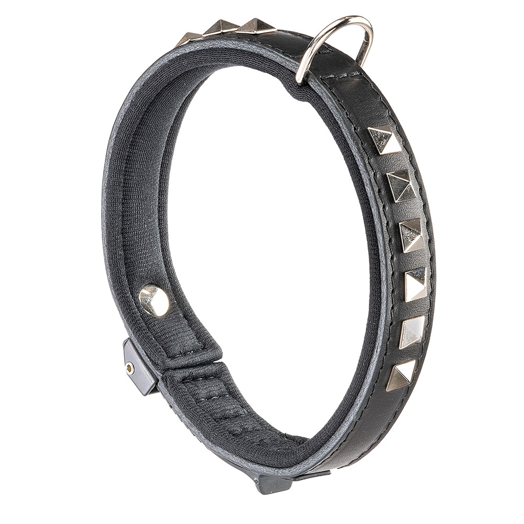 The leather dog collars Giotto have a perfect wearability thanks to the patented micro-regulation system and to their soft internal padding. This leather black-coloured version has some small metal applications with the shape of pyramids making it very original and captivating: perfect for dogs who want to distinguish from the others!