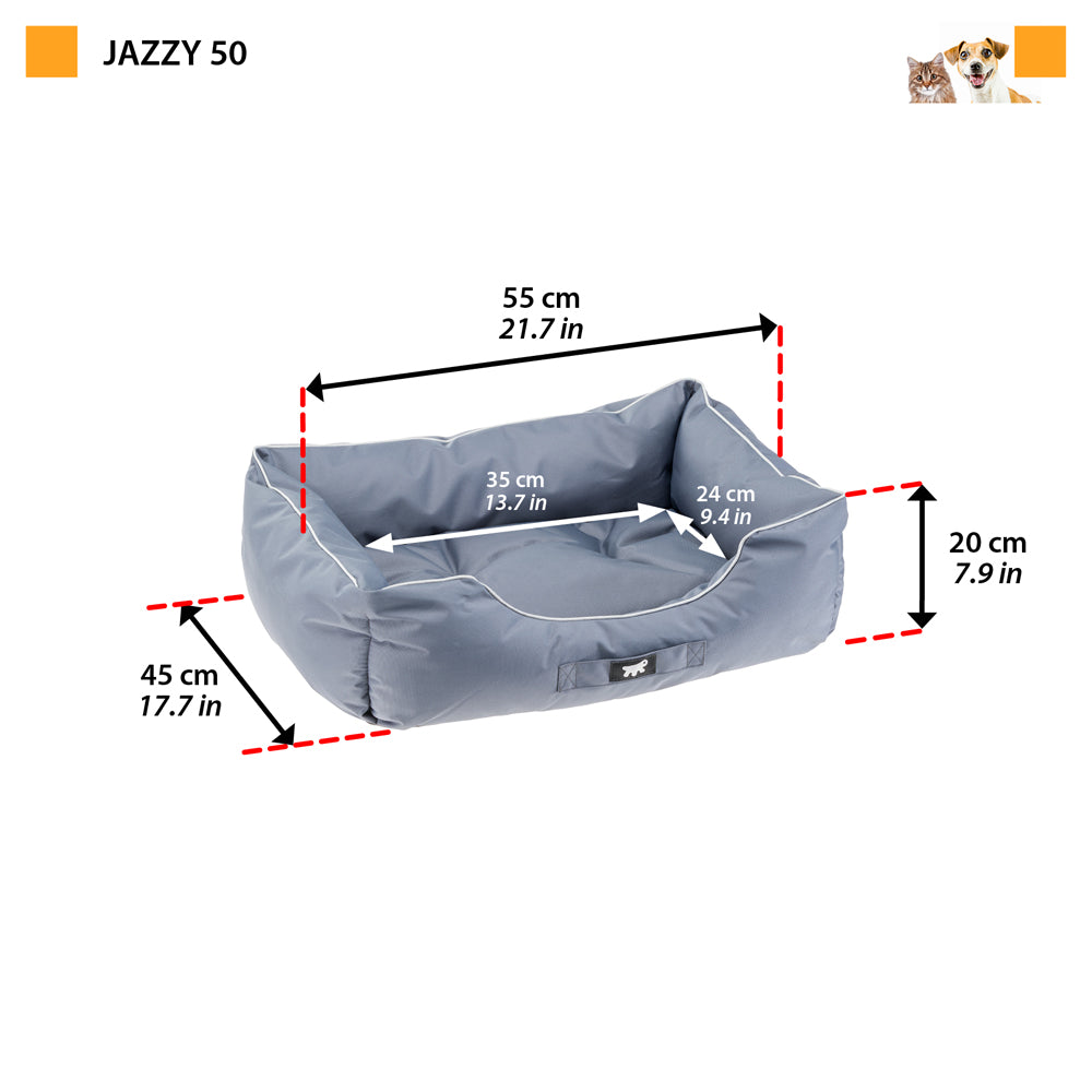 Jazzy is a small sofa for dogs made of high-tech fabric and complete with a cushion, suitable for medium-small pets. The internal padding will ensure Fido the utmost comfort, while the shape with a lowered entrance was designed to make it easy for your pet to get on and off of it. The special quality and strength of the high-tech material used ensures that the product is completely water-repellent and it is also scratch-resistant and able to withstand extensive use. The bed is practical to use, therefore, and maintenance is also equally easy. It isn't difficult to keep it looking attractive and impeccable, as it can be machine-washed at 30° C.