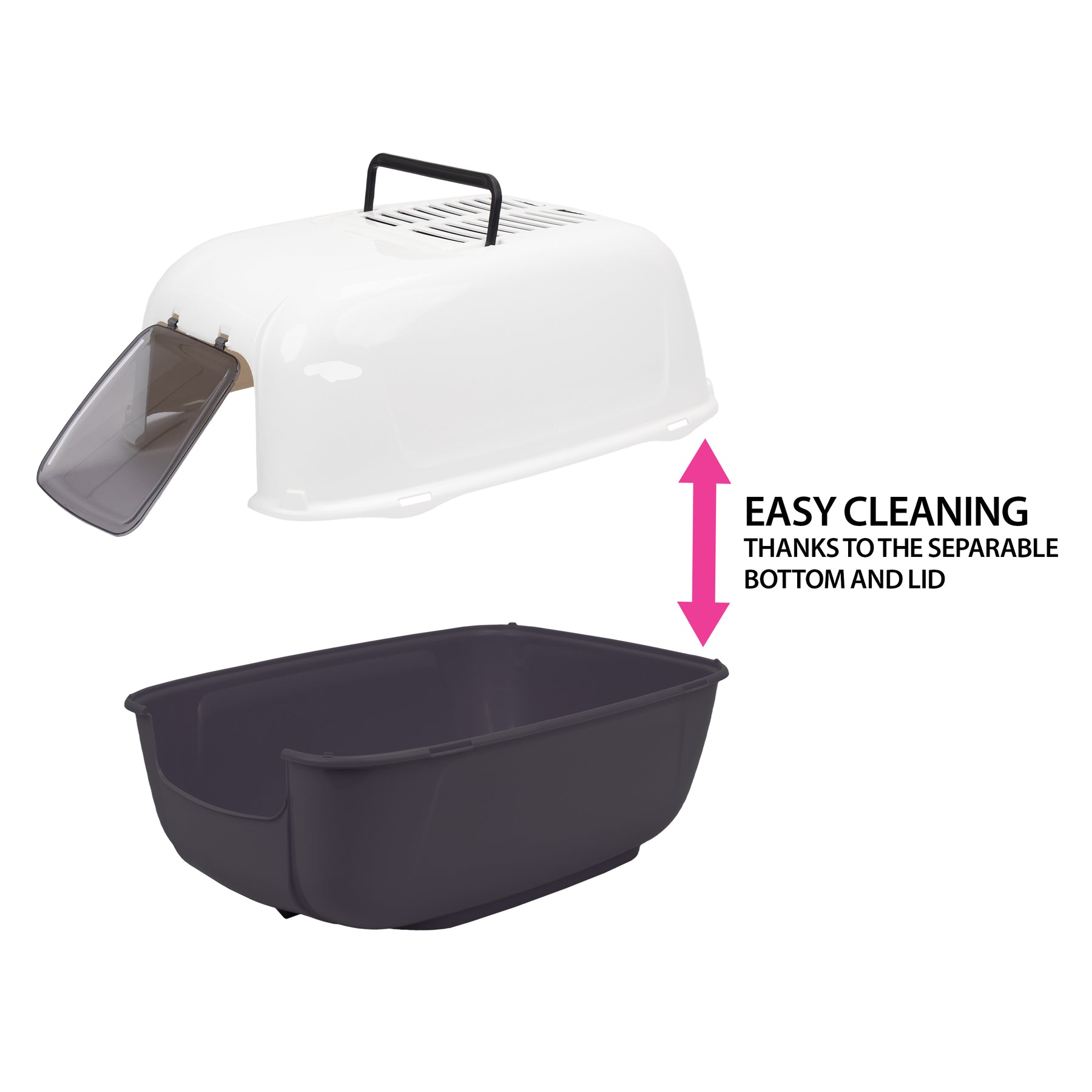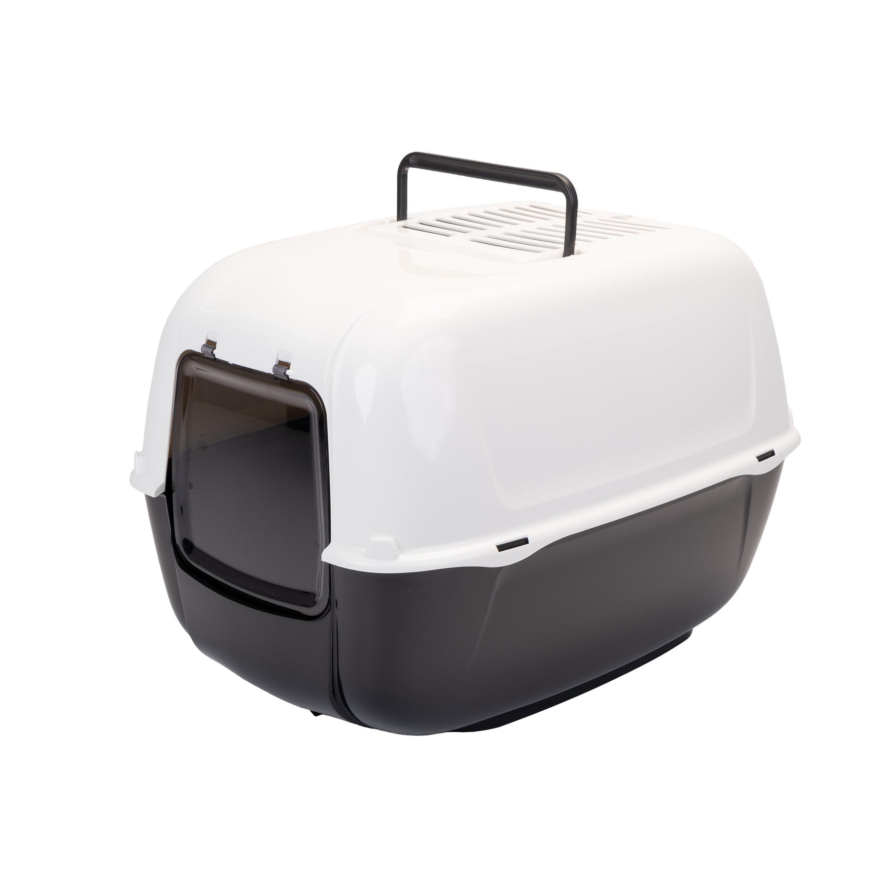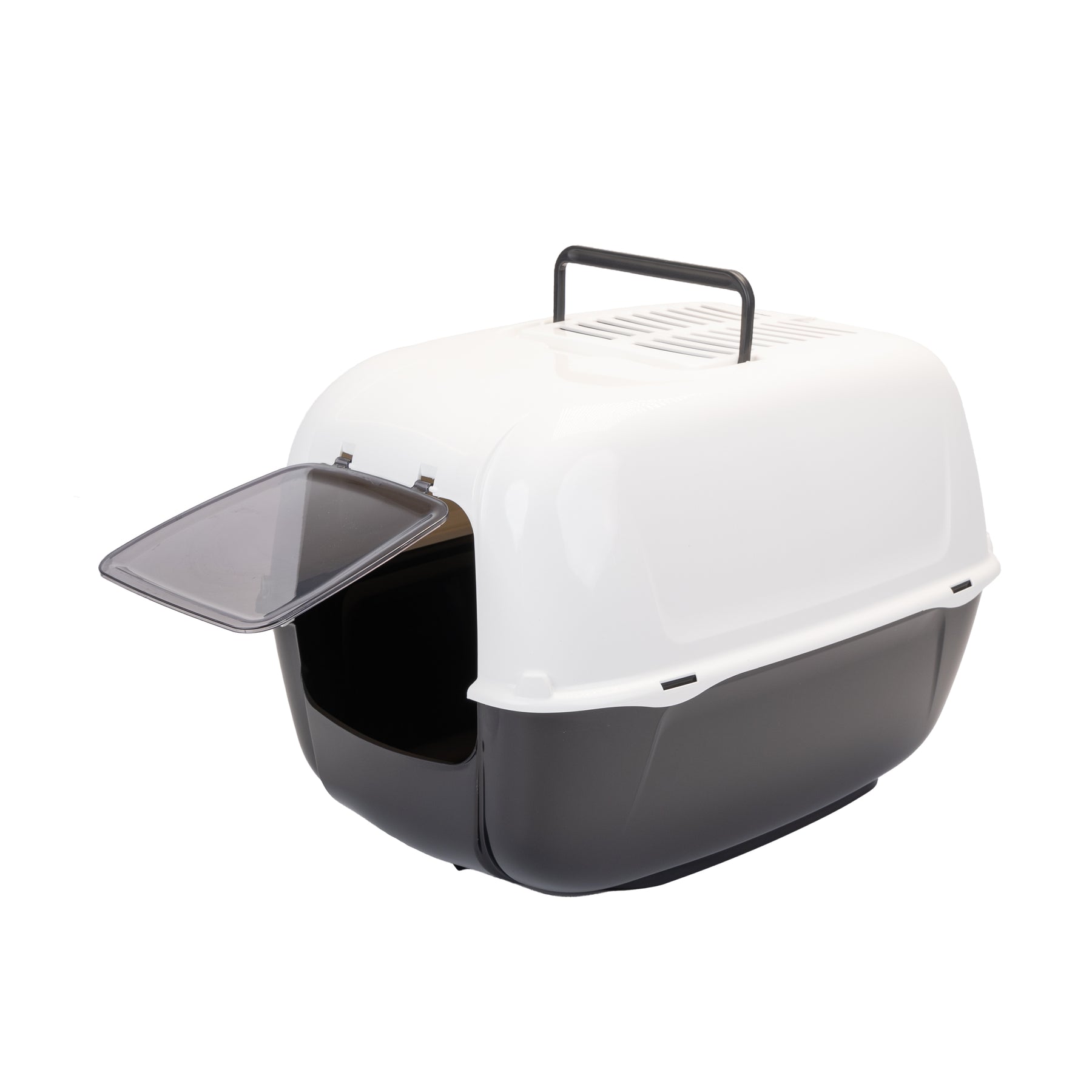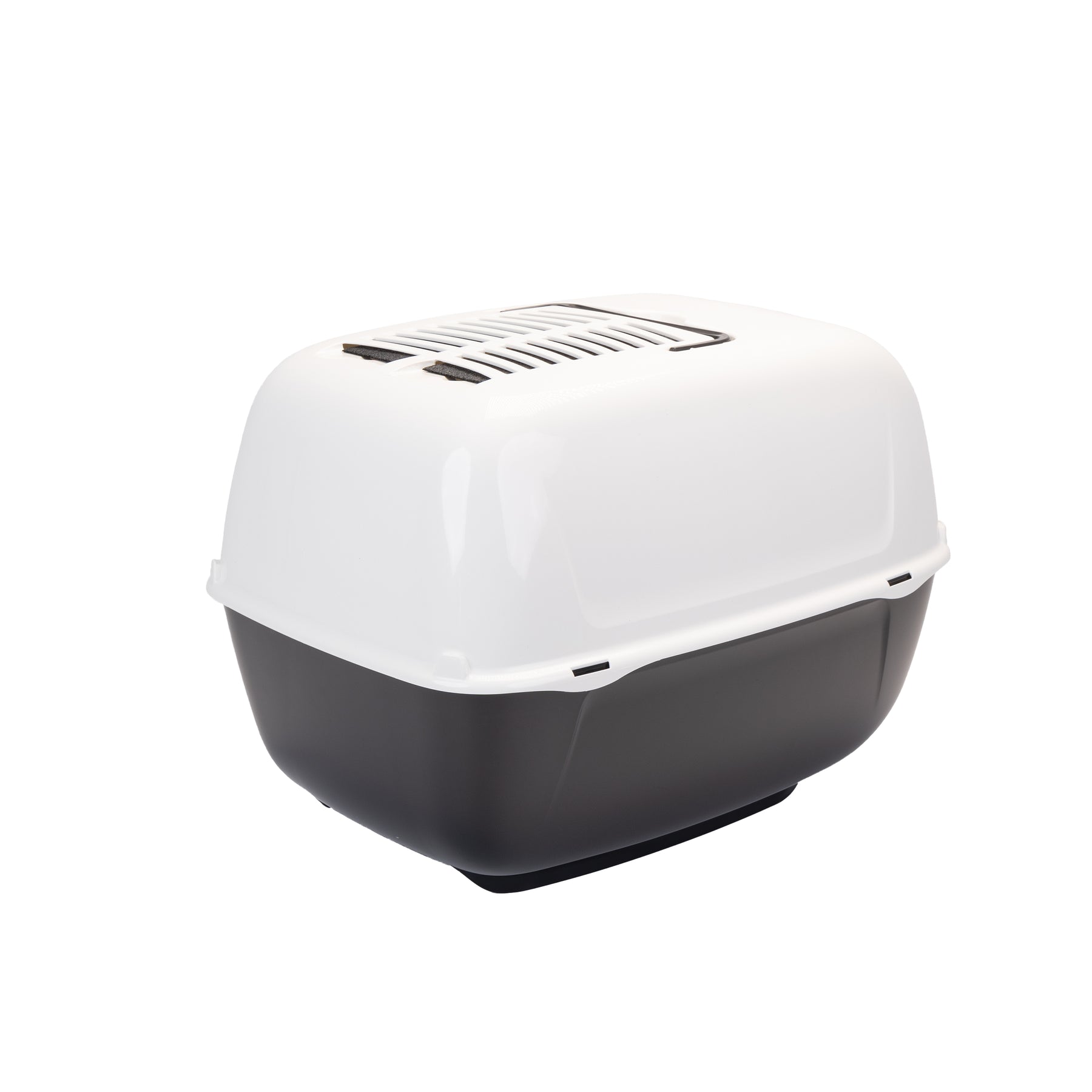 Prima is a very practical covered cat litter tray, made of plastic and equipped with everything necessary to ensure your cat the utmost privacy and tranquillity while going about his daily business. It comes complete with a handle that allows you to place it wherever you prefer and contains an essential charcoal filter to neutralize odours. It is easy to keep clean, thanks to its the interlocking opening and closing system. The cat litter tray Prima has been recently restyled and thus results even more user-friendly and welcoming: its rounded shape will give your cat larger space and comfort inside.