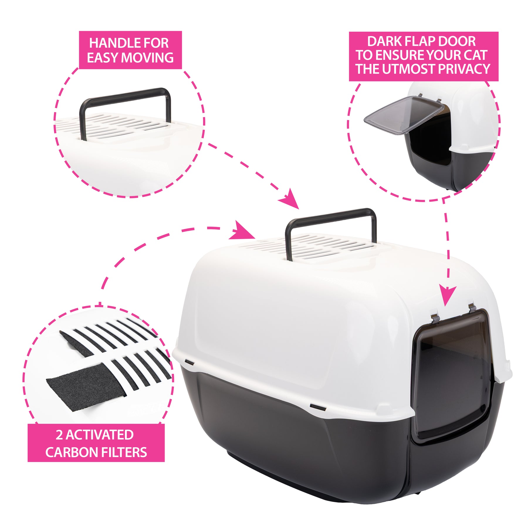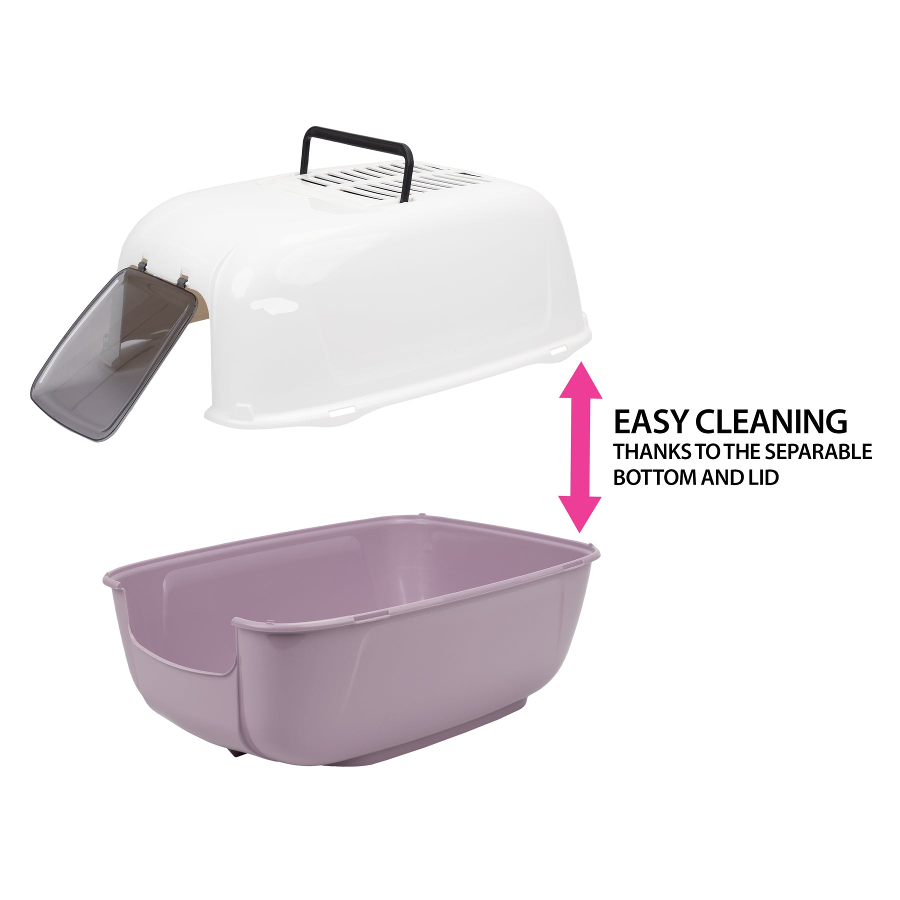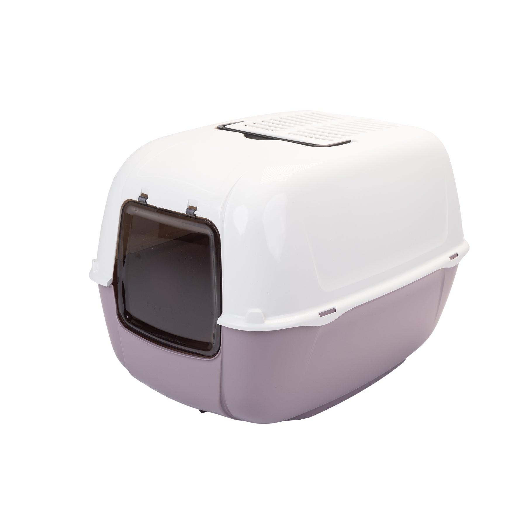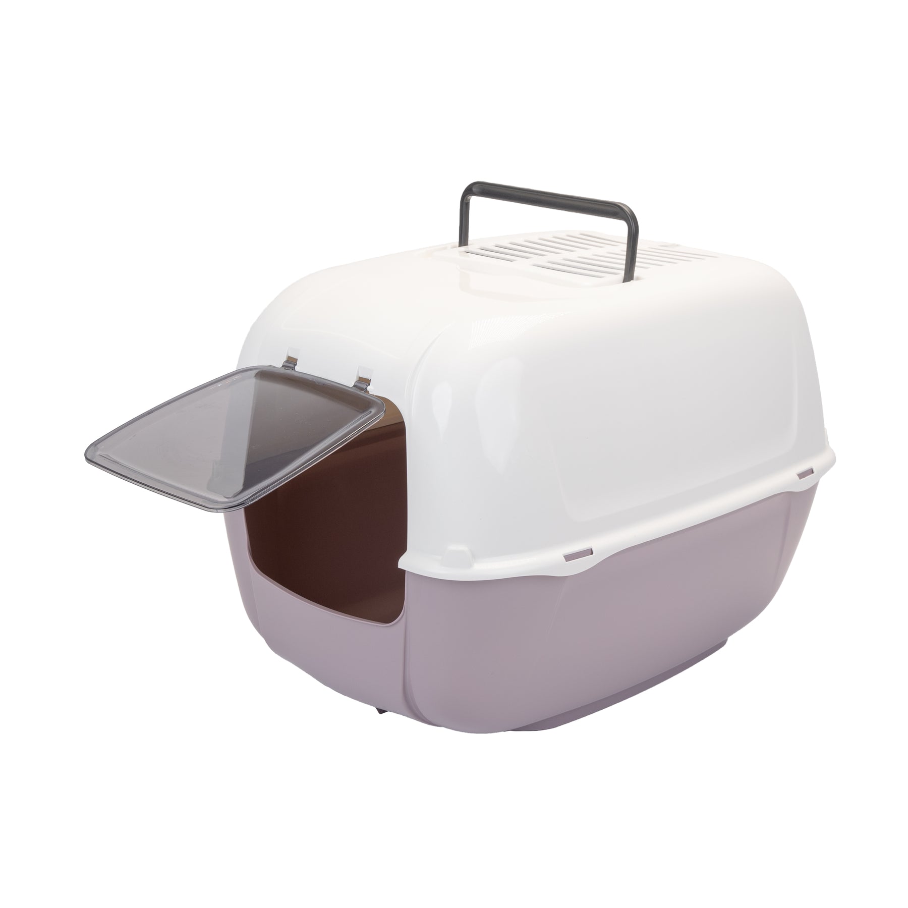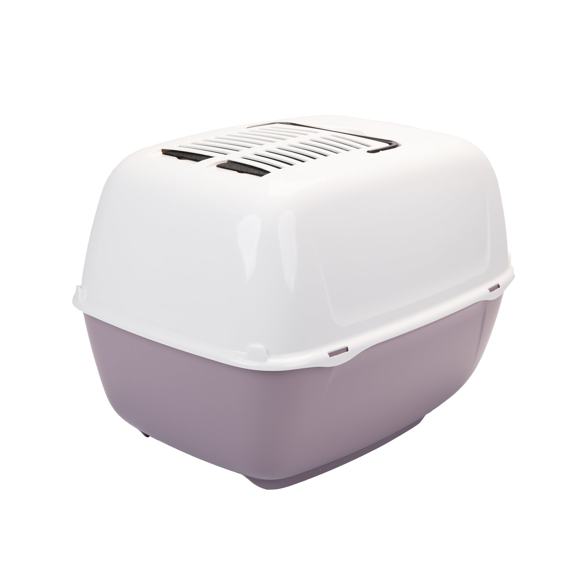 Prima is a very practical covered cat litter tray, made of plastic and equipped with everything necessary to ensure your cat the utmost privacy and tranquillity while going about his daily business. It comes complete with a handle that allows you to place it wherever you prefer and contains an essential charcoal filter to neutralize odours. It is easy to keep clean, thanks to its the interlocking opening and closing system. The cat litter tray Prima has been recently restyled and thus results even more user-friendly and welcoming: its rounded shape will give your cat larger space and comfort inside.
