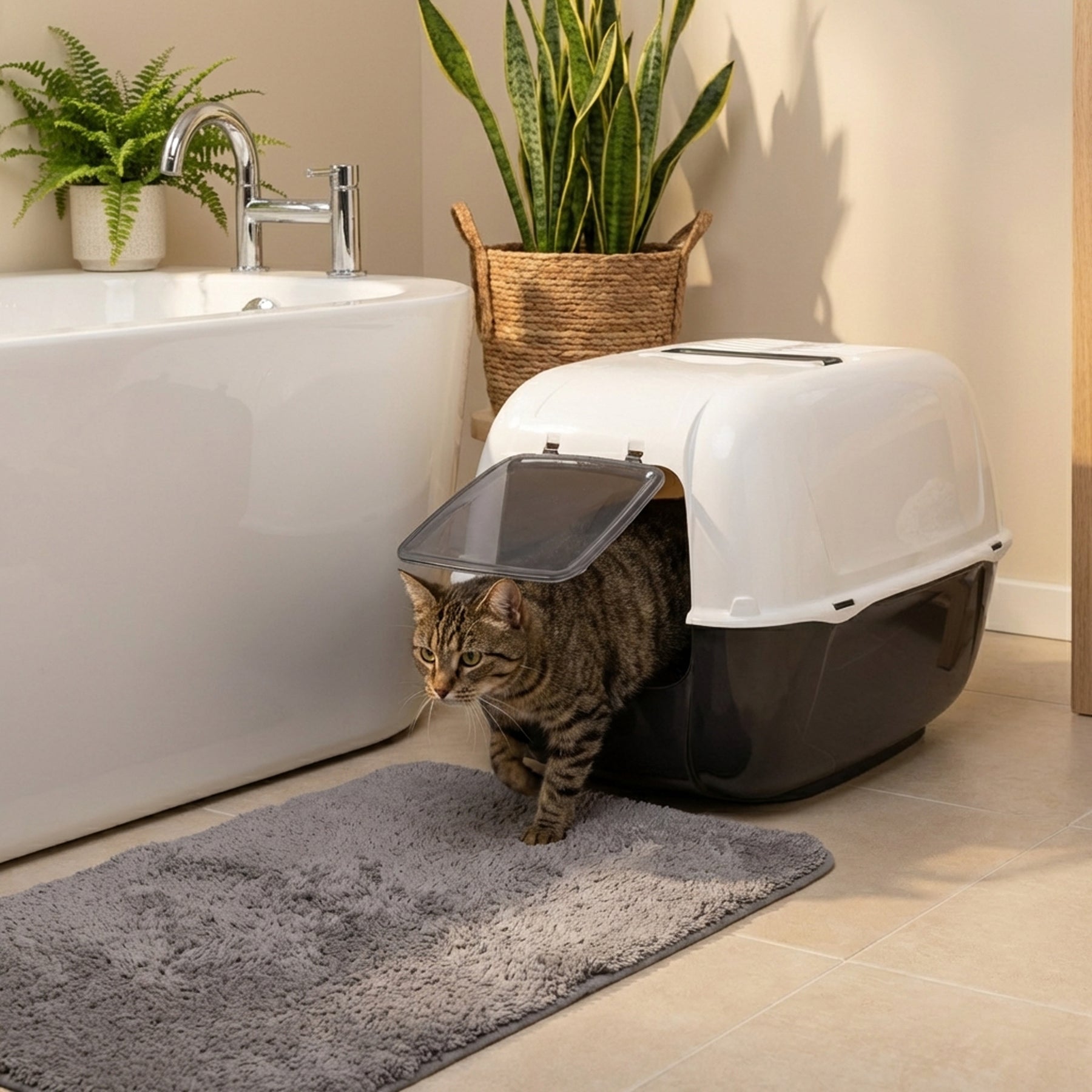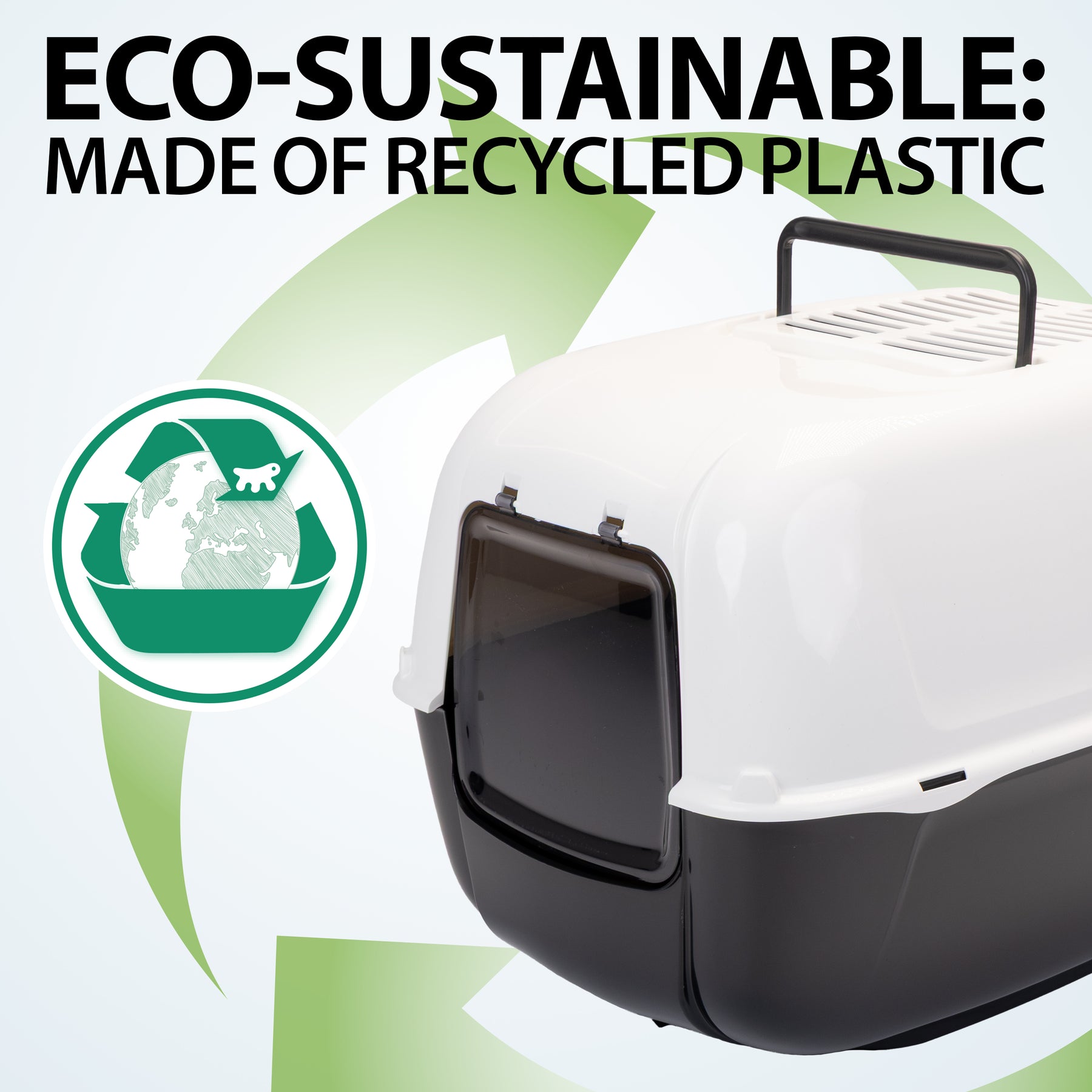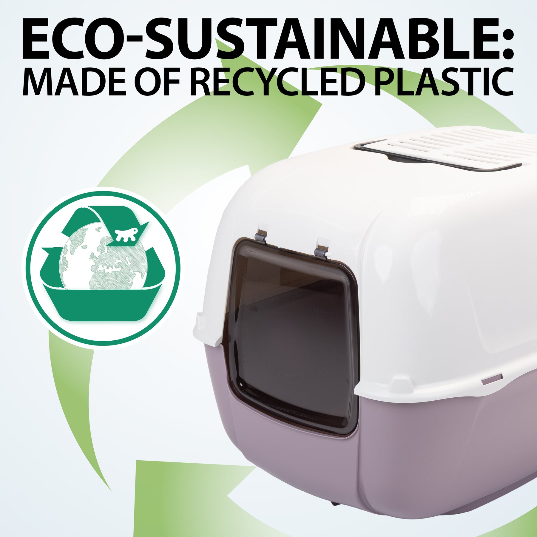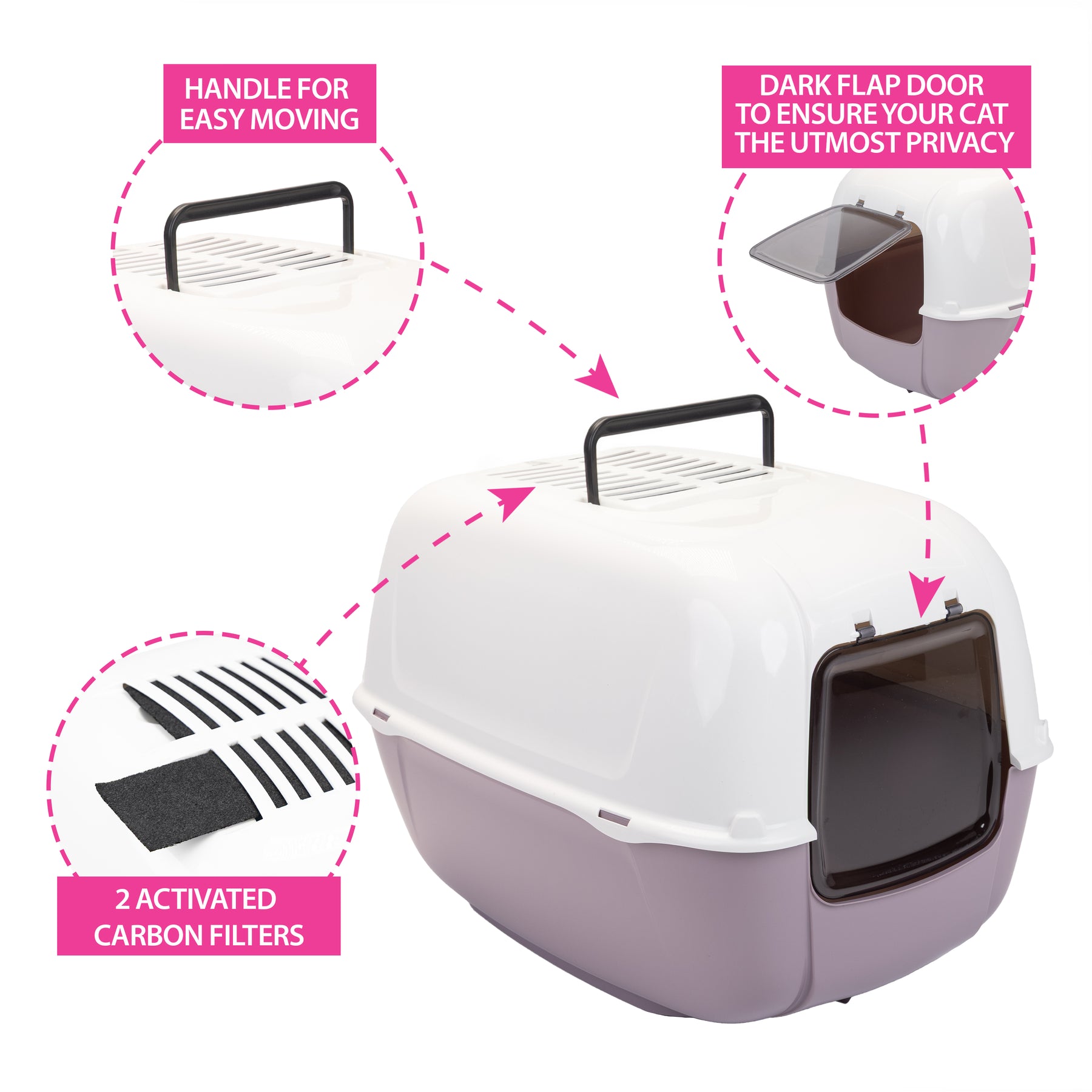Prima is a very practical covered cat litter tray, made of plastic and equipped with everything necessary to ensure your cat the utmost privacy and tranquillity while going about his daily business. It comes complete with a handle that allows you to place it wherever you prefer and contains an essential charcoal filter to neutralize odours. It is easy to keep clean, thanks to its the interlocking opening and closing system. The cat litter tray Prima has been recently restyled and thus results even more user-friendly and welcoming: its rounded shape will give your cat larger space and comfort inside.