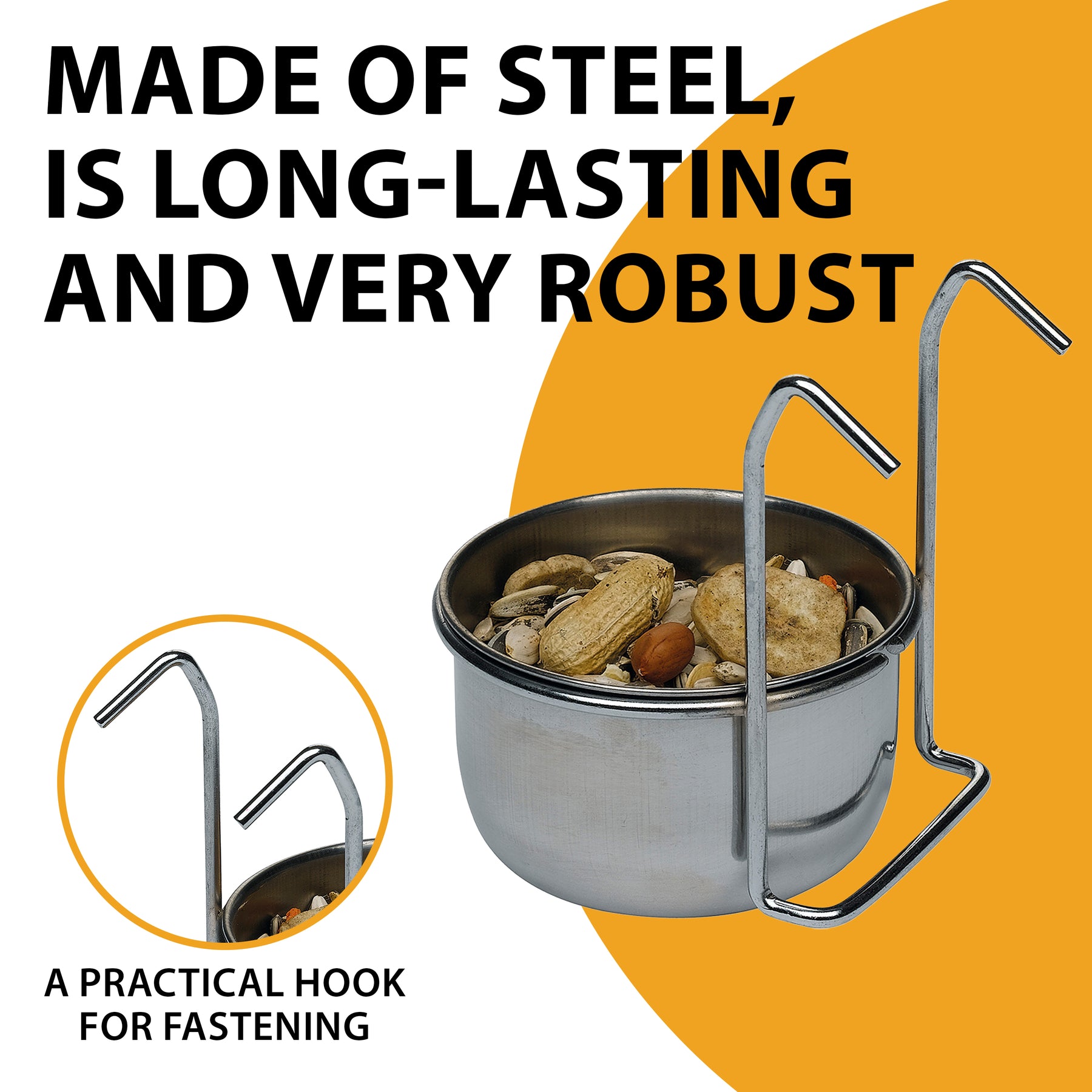 In three sizes available, Sirio feeders for parrots are equipped with a hook for fastening. They have a rounded shape, capacious, perfect to contain seed or food mix; the use of steel make them very hygienic, long-lasting and easy to clean.
