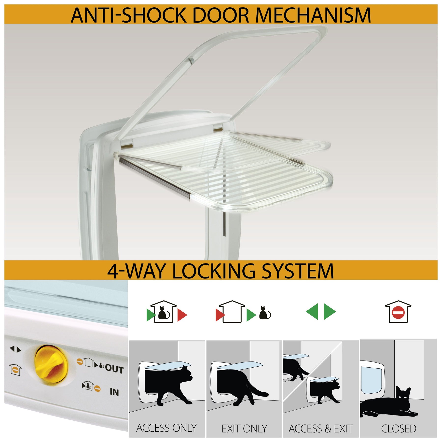 - 4-way closure: entrance/exit, entrance only, exit only, or locked