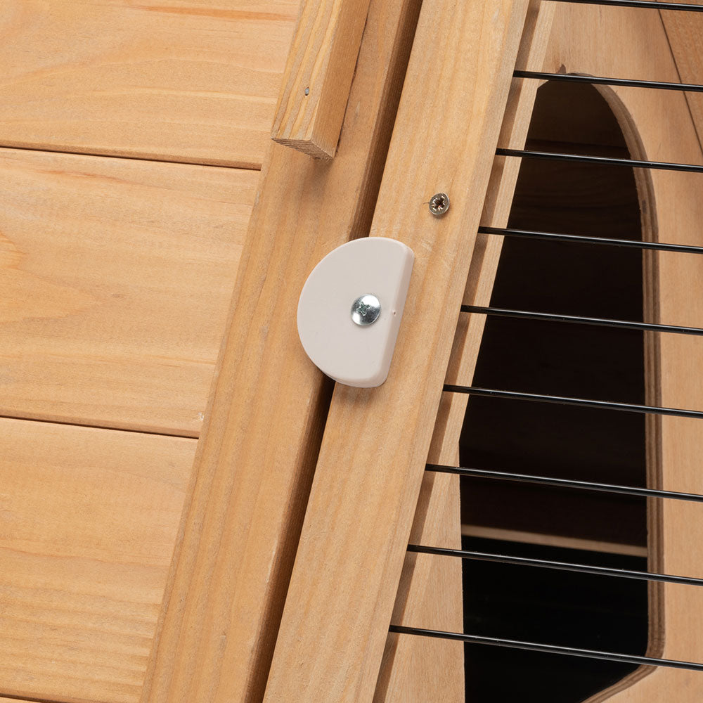 • Wooden rabbit hutch with large front door that can be opened from the outside and a safety lock